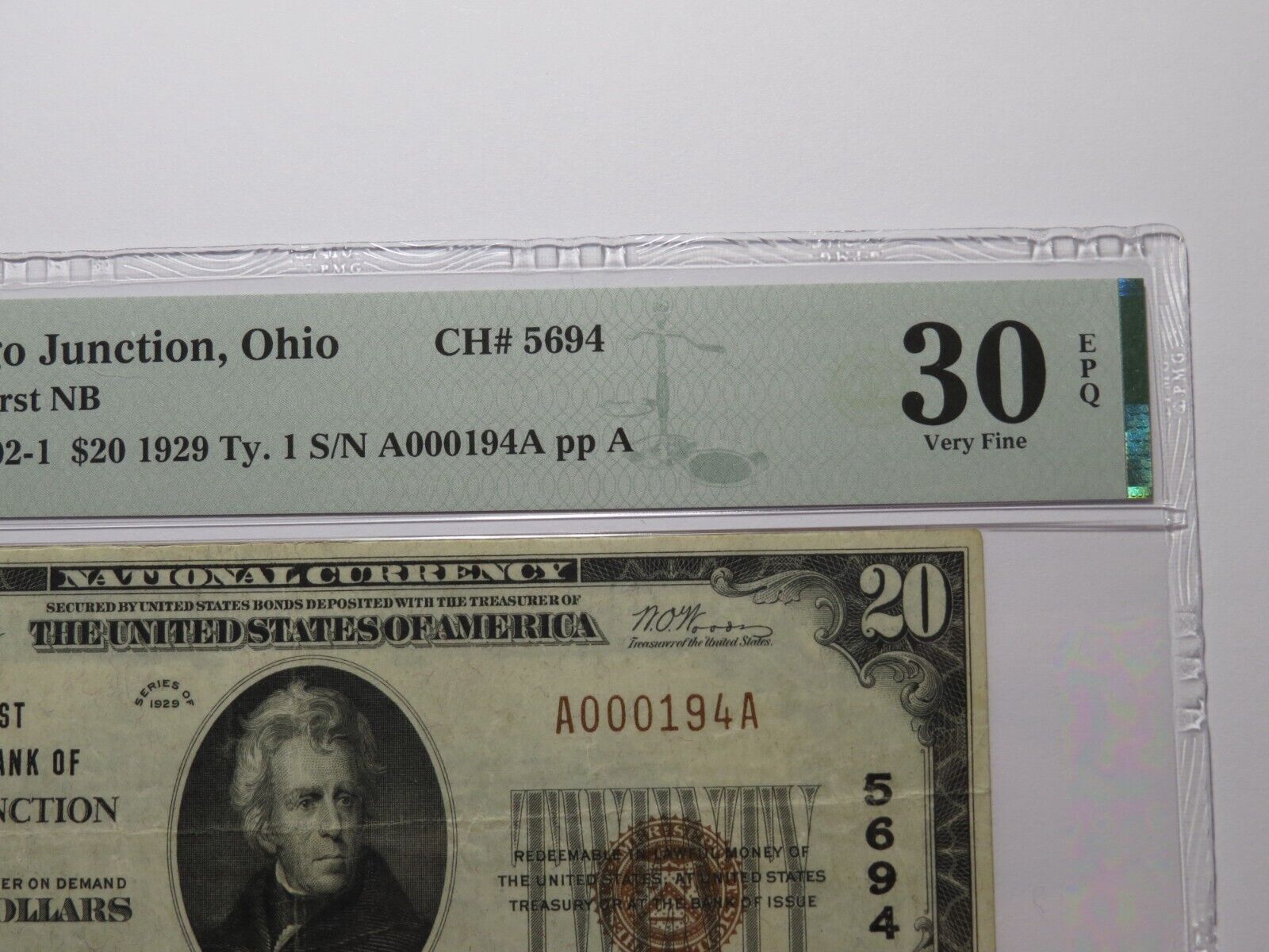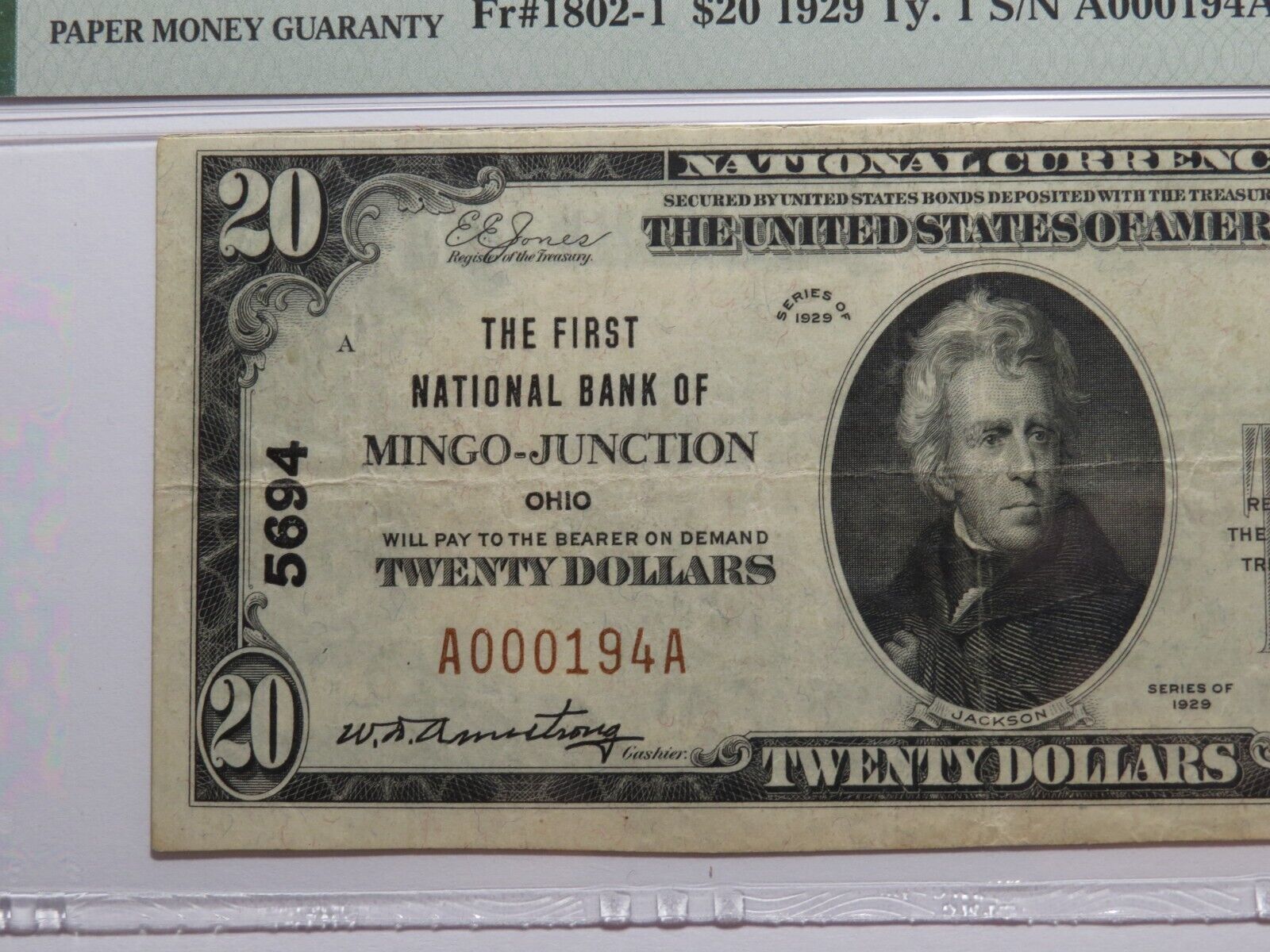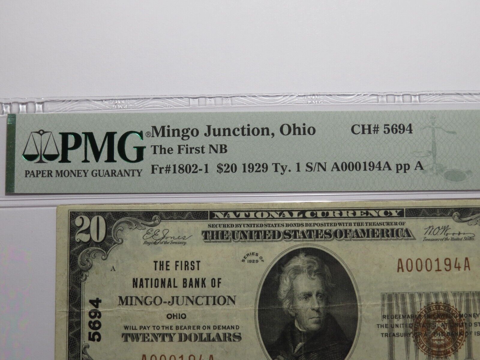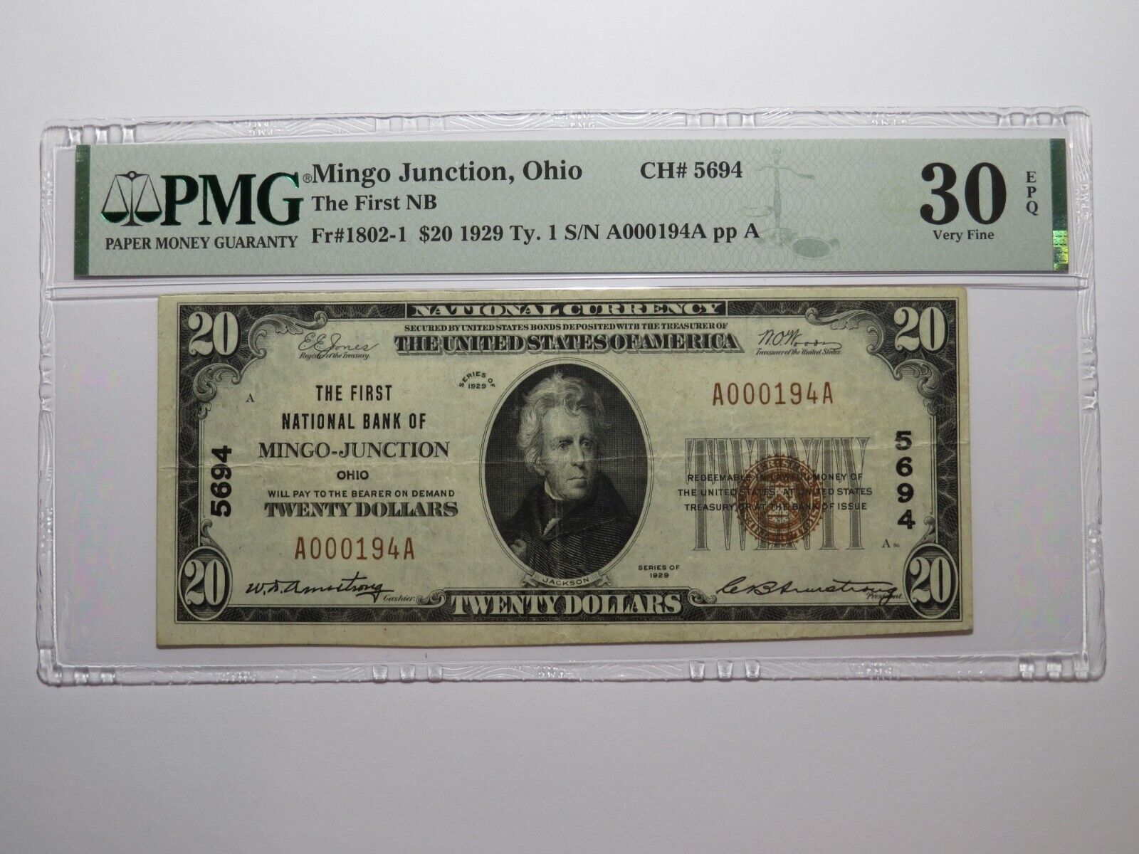 Up for auction is a $20 1929 Mingo Junction Type 1 National Currency Note. This note was issued by The First National Bank of Mingo Junction. It is Charter #5694. Mingo Junction is a tough to find Ohio town! This note has been graded Very Fine 30 EPQ by PMG. This is a problem free note. This bill is a must have for any collector of National Currency!