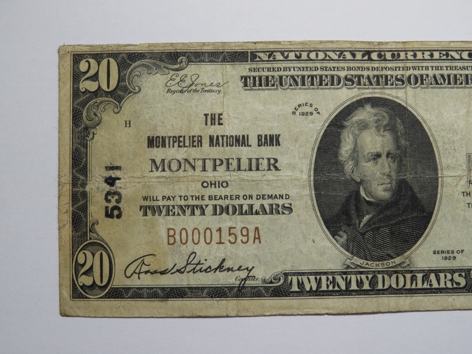 Up for auction is a $20 1929 Montpelier Ohio Type 1 National Currency Note. This note was issued by The Montpelier National Bank. It is Charter #5341. Montpelier is a tough to find Ohio town! This note still has some good crisp left to it and is in good shape with no major issues. This is a great looking bill that is a must have for any collector of National Bank Notes!