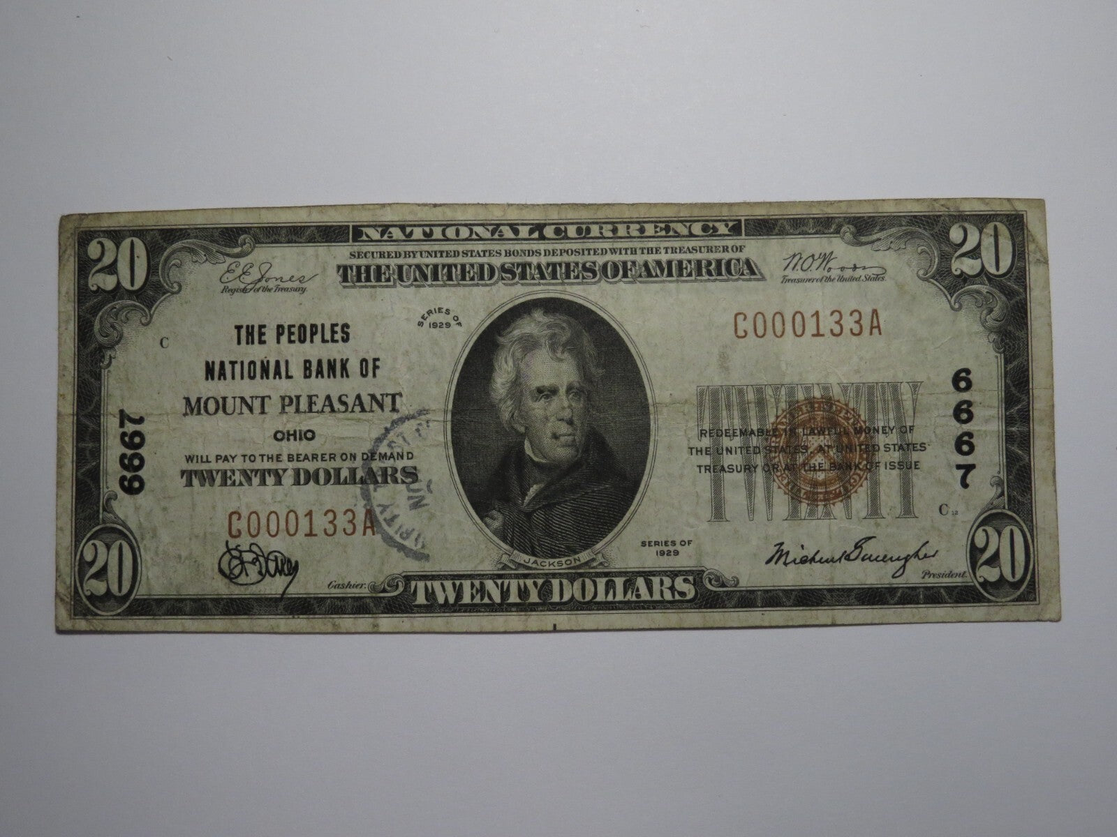 Up for auction is a $20 1929 Mount Pleasant Ohio Type 1 National Currency Note. This note was issued by The Peoples National Bank of Mount Pleasant. It is Charter #6667. Mount Pleasant is a tough to find Ohio town! This note has a good amount of crisp left to it and is in good shape. The only flaw is some teller ink on the front of the note. This bill is a must have for any collector of National Currency!