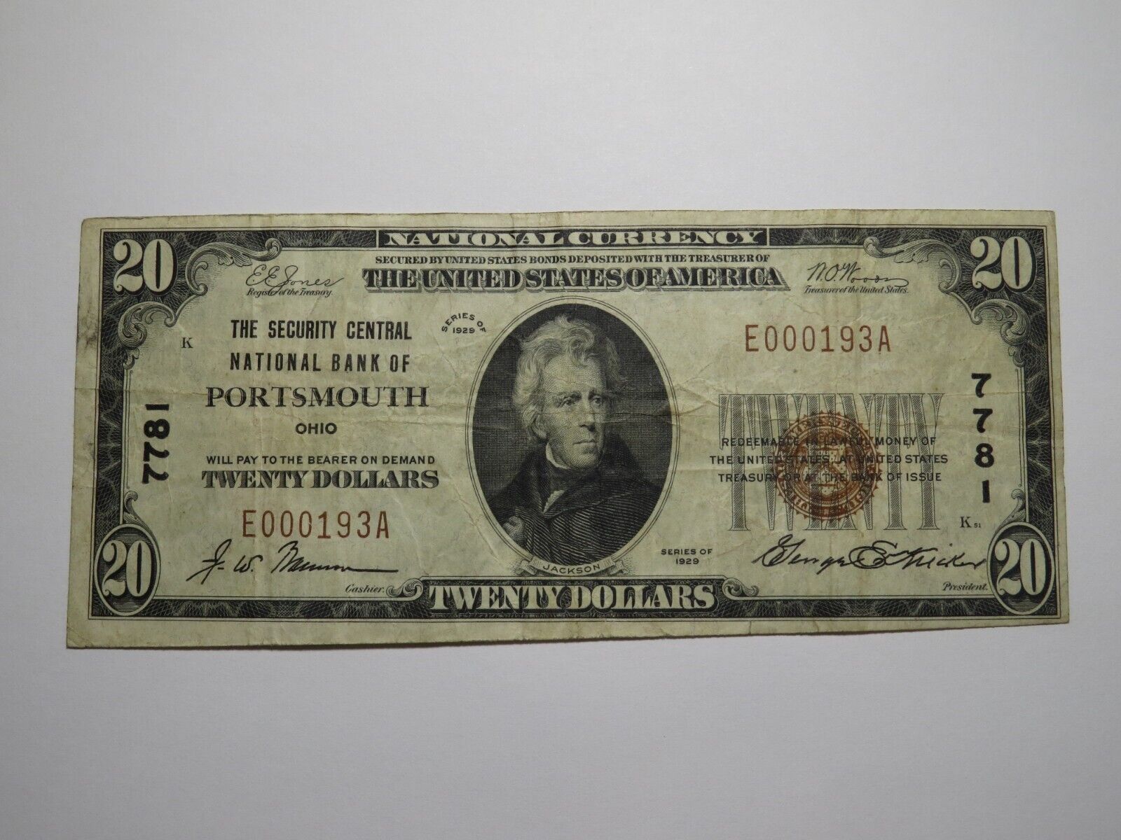 Up for auction is a $20 1929 Portsmouth Ohio Type 1 National Currency Note. This note was issued by The Security Central National Bank of Portsmouth. It is Charter #7781. Portsmouth is an always in demand Ohio town. This note still has some good crisp left to it and is in good shape with no major issues. This bill is a must have for any collector of National Currency!