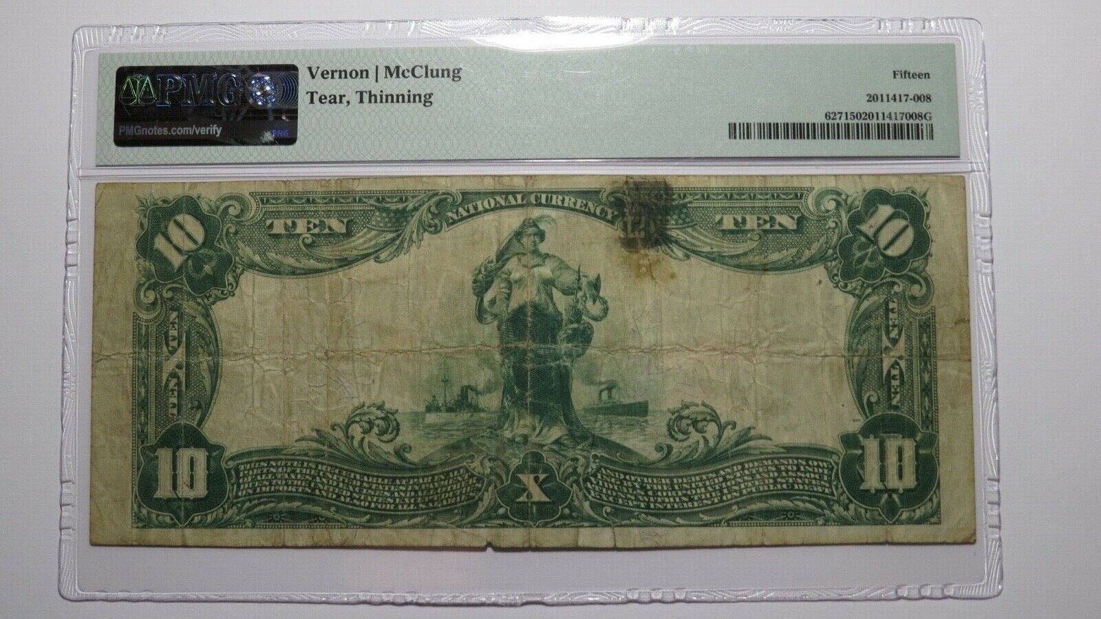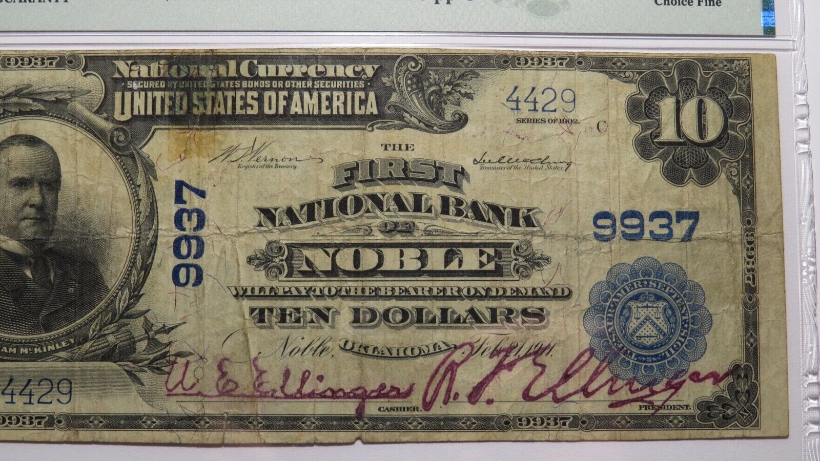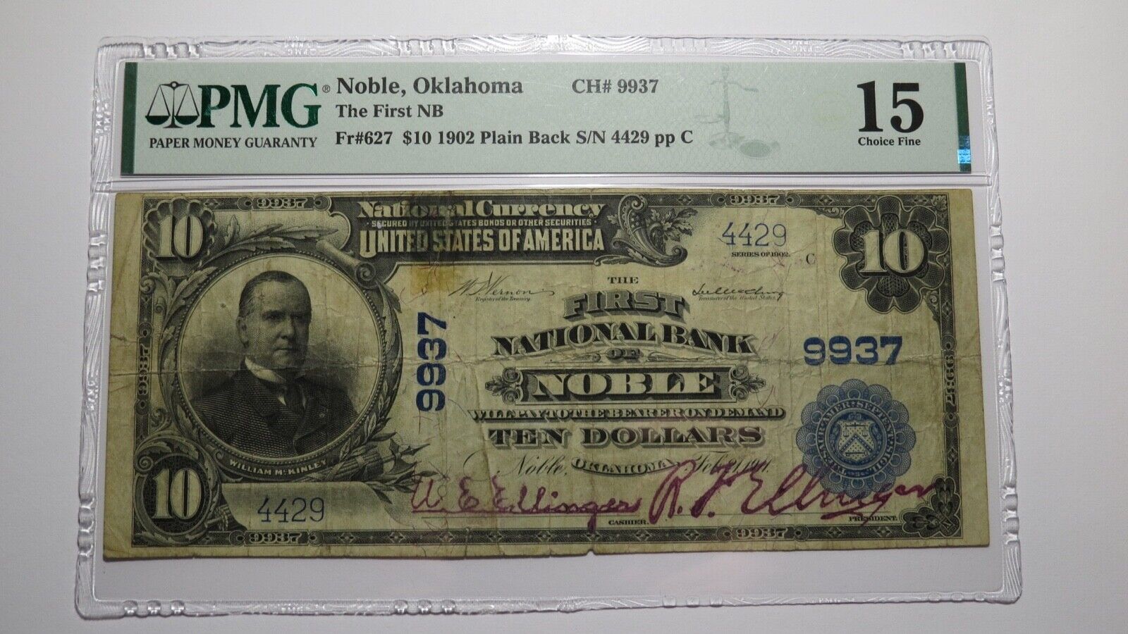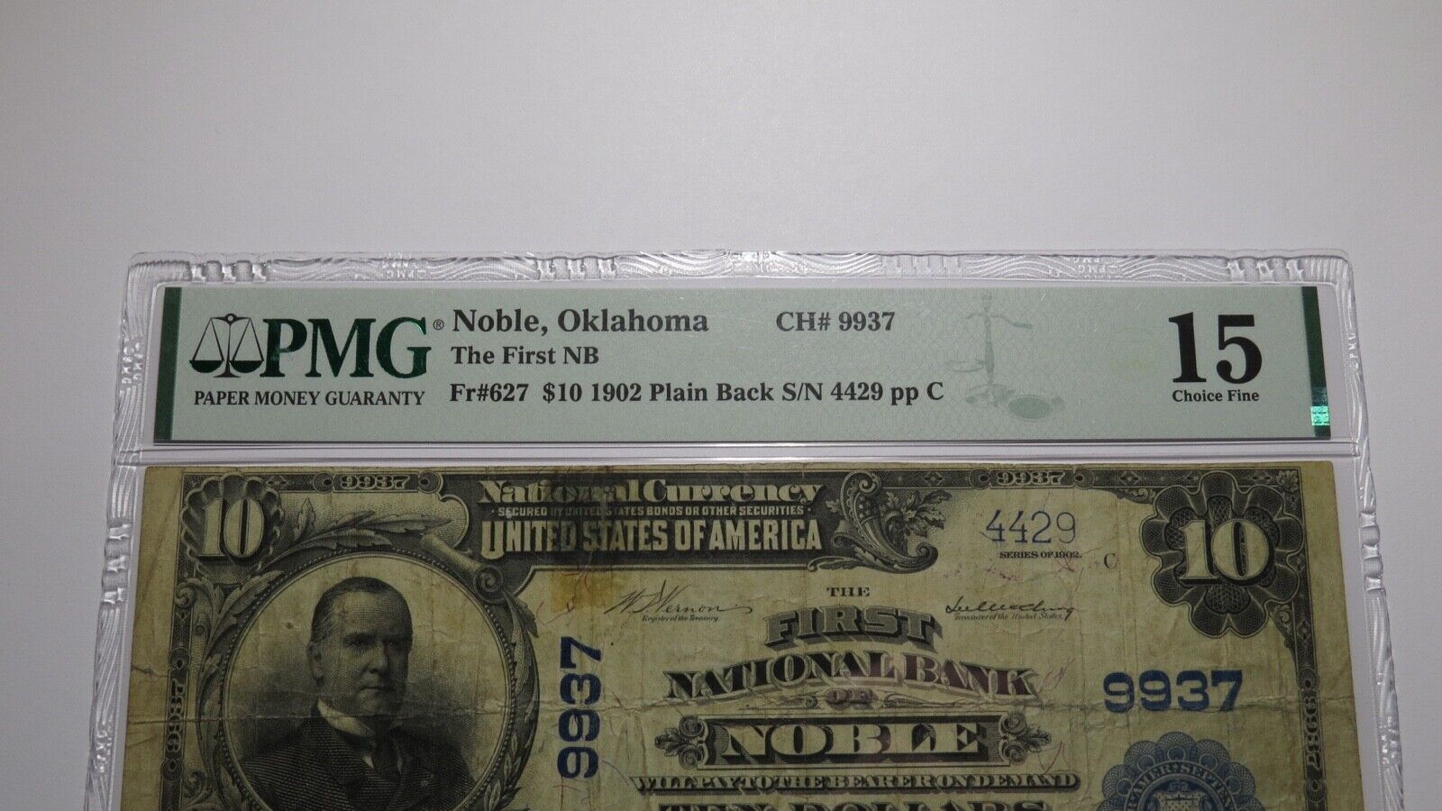 Up for auction is a $10 1902 Noble Oklahoma Plain Back National Currency Note. It is issued from The First National Bank of Noble. It is Charter #9937. This is a ONE BANK TOWN! This note is graded Choice Fine 15 by PMG. It is noted that there is a minor tear and some paper thinning. This is a gorgeous note! This bill is a must have for any collector of National Currency!