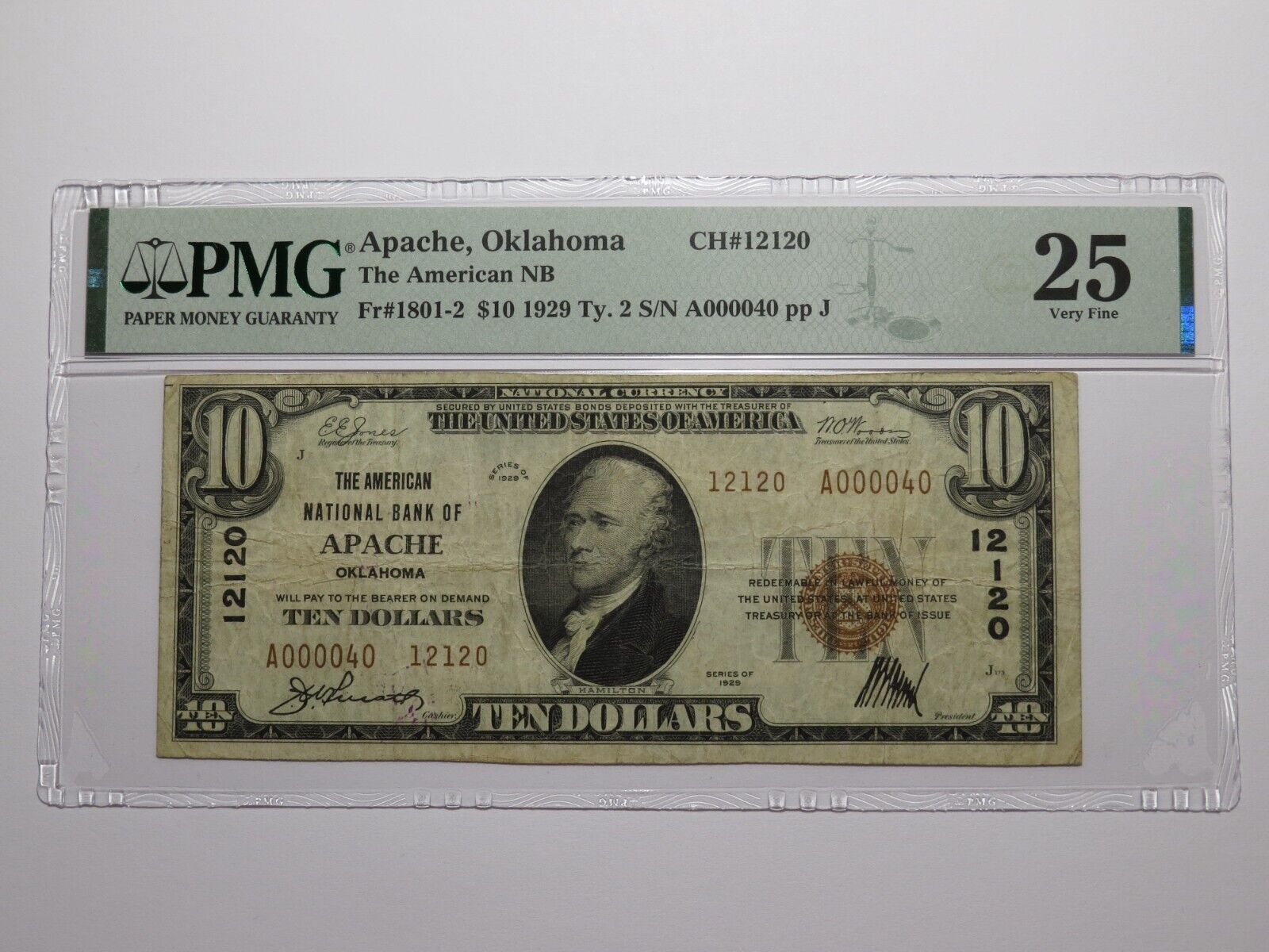 Up for auction is a $10 1929 Apache Oklahoma Type 2 National Currency Note.  This note was issued by The American National Bank of Apache.  It is Charter #12120.  Apache is an IMPOSSIBLE to find Oklahoma town!  This note has been graded Very Fine 25 by PMG.  This is a problem free note.  This bill is a must have for any collector of National Currency!