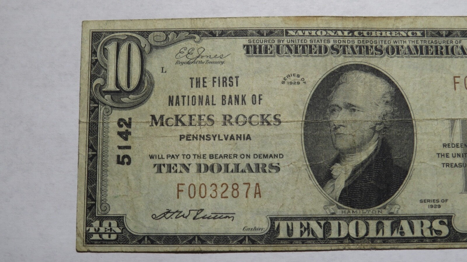 Up for auction is a $10 1929 McKees Rocks Pennsylvania National Currency Note. It is issued from The First National Bank Of McKees Rocks. It is Charter #5142. This is a ONE BANK TOWN! This note has a lot of crisp left to it and is in great shape with no issues to speak of! This bill is a must have for any collector of National Currency!