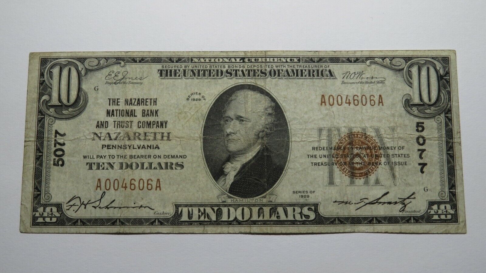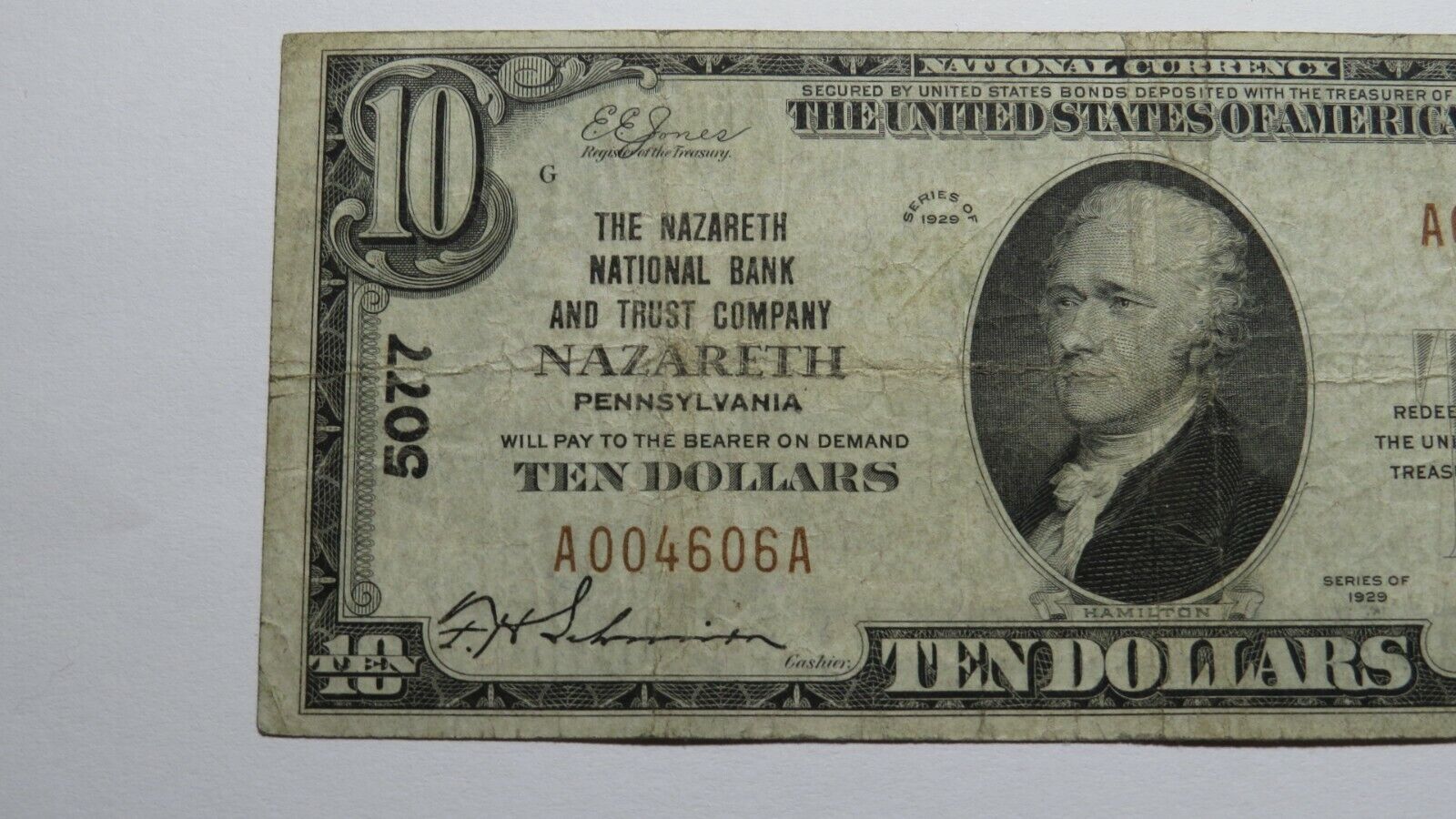 $10 1929 Nazareth Pennsylvania PA National Currency Bank Note Bill! Ch. #5077 VF