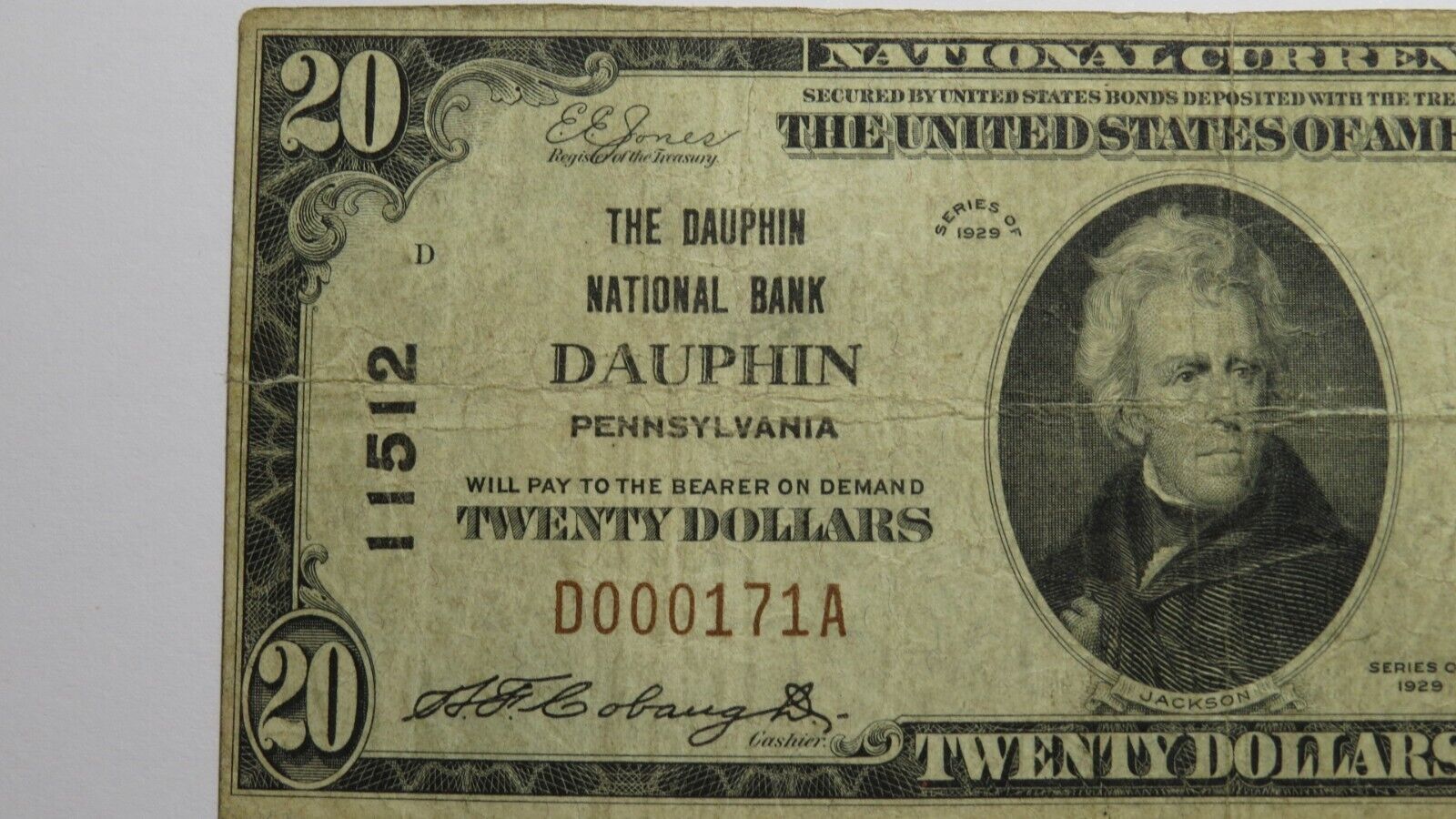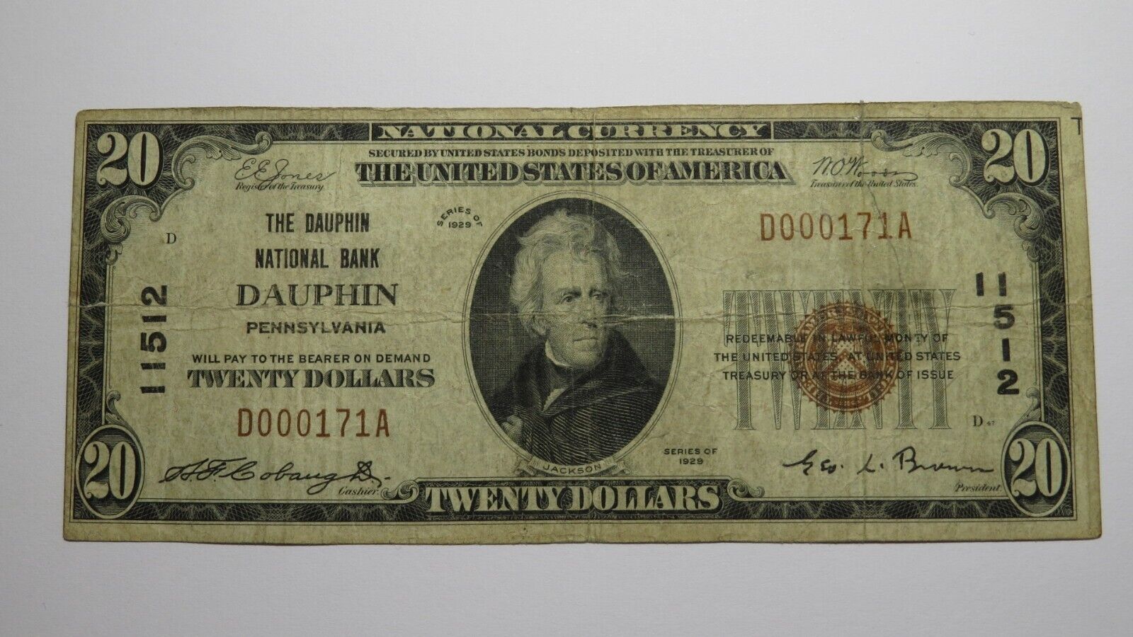 Up for auction is a $20 1929 Dauphin Pennsylvania Type 1 National Currency Note. This note was issued by The Dauphin National Bank. It is Charter #11512. This is a ONE BANK TOWN! This note has a good amount of crisp left to it and is in good shape with no issues. This bill is a must have for any collector of National Currency!