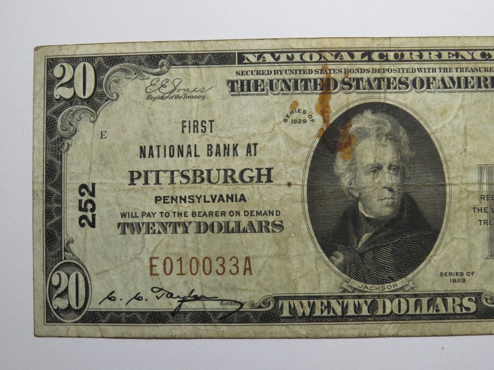 Up for auction is a $20 1929 Pittsburgh Pennsylvania National Currency Note. This note was issued by The First National Bank at Pittsburgh. It is Charter #252. This is an always in demand Pittsburgh Charter. This note has a good amount of crisp left to it and is in good overall shape. The note does have a paper clip rust mark but that is the only flaw. This bill is a must have for any collector of National Currency!