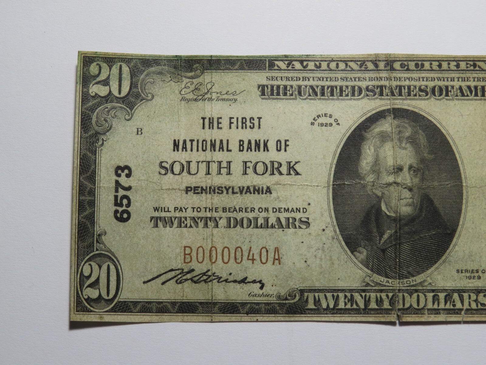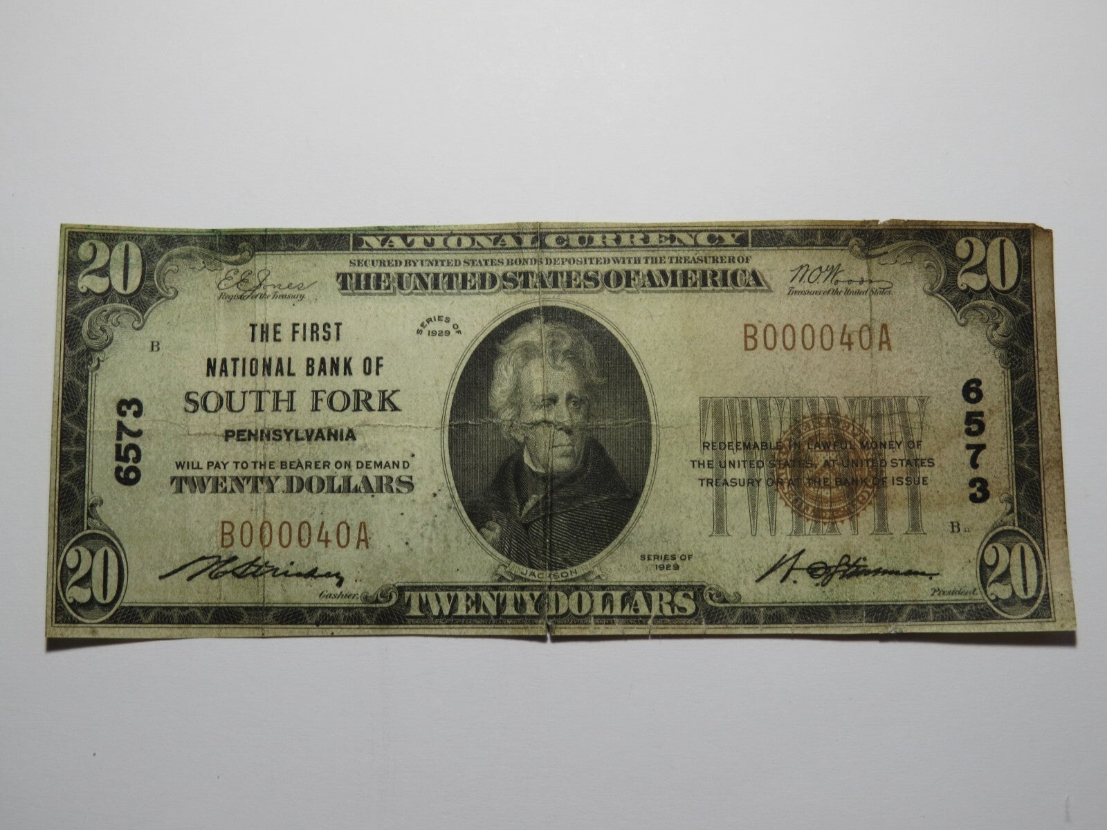 Up for auction is a $20 1929 South Fork Pennsylvania National Currency Note