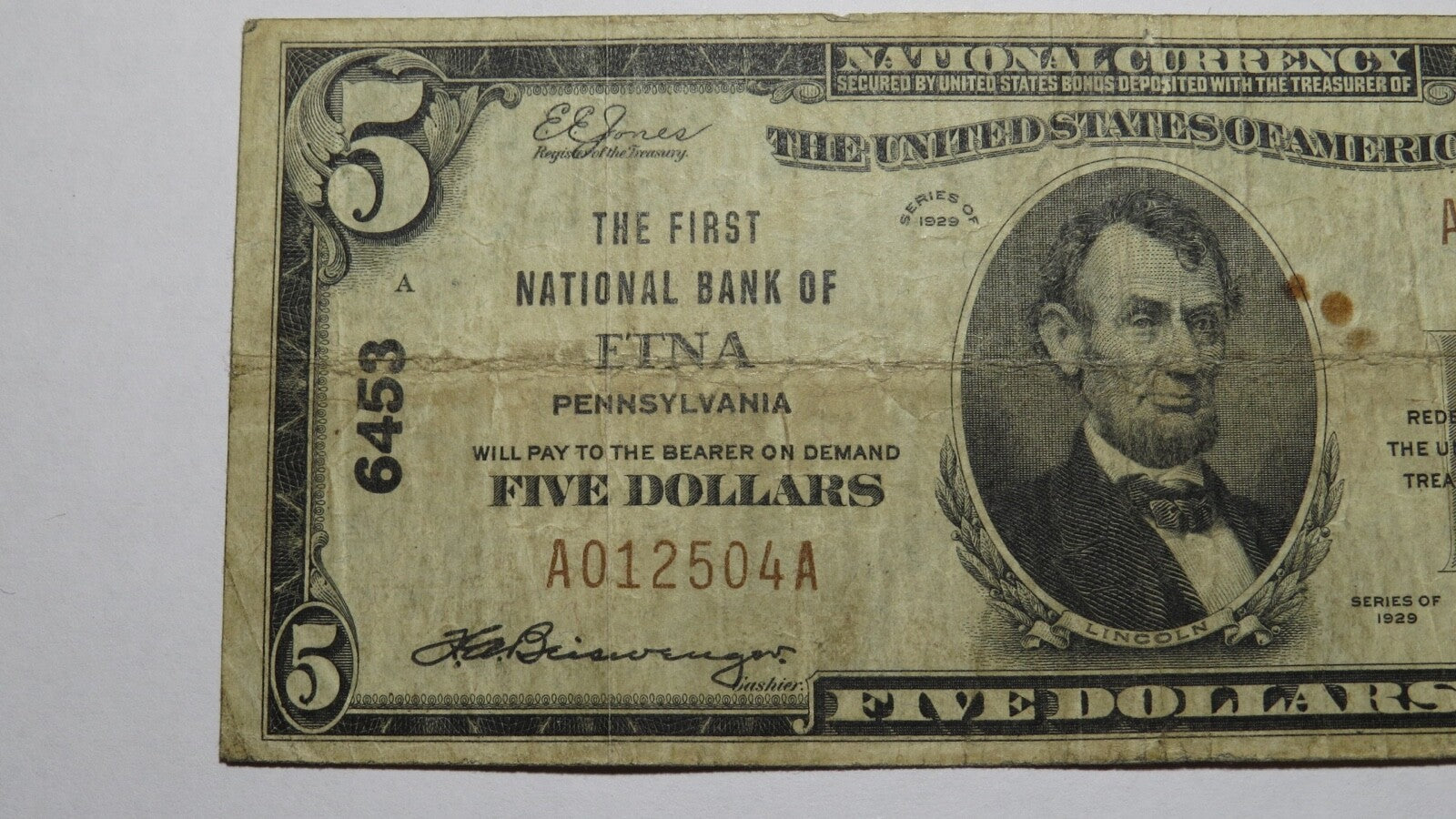 Up for auction is a $5 1929 Etna Pennsylvania Type 1 National Currency Note. It is issued from The First National Bank of Etna. It is Charter #6453. This is a ONE BANK TOWN! This note has a good amount of crisp left to it and is in good, but well circulated shape. This bill is a must have for any collector of National Currency!