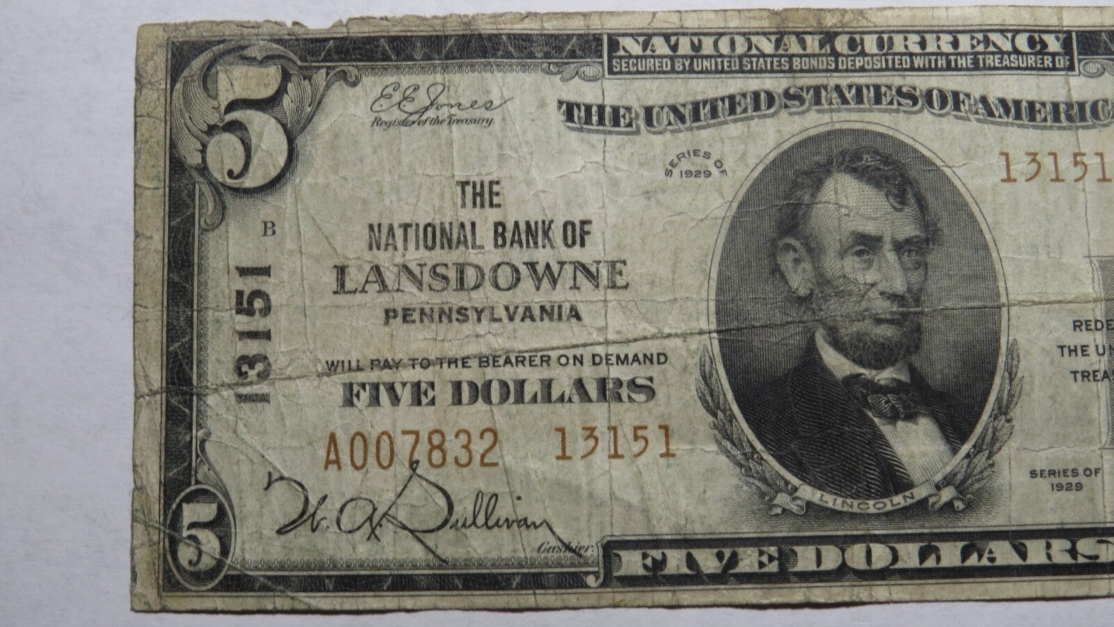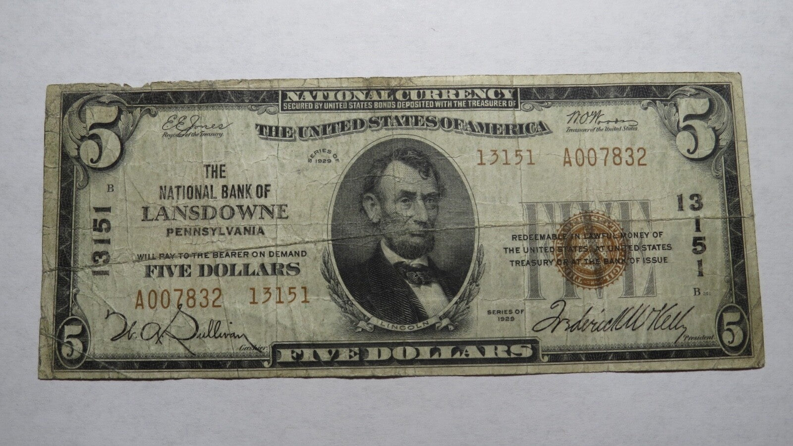 Up for auction is a $5 1929 Lansdowne Pennsylvania National Currency Note. It is issued from The National Bank Of Lansdowne. It is Charter #13151. This is a ONE BANK TOWN you will not find for sale anywhere else! This note has a good amount of crisp left to it and is in good shape with no major issues! This bill is a must have for any collector of National Currency!
