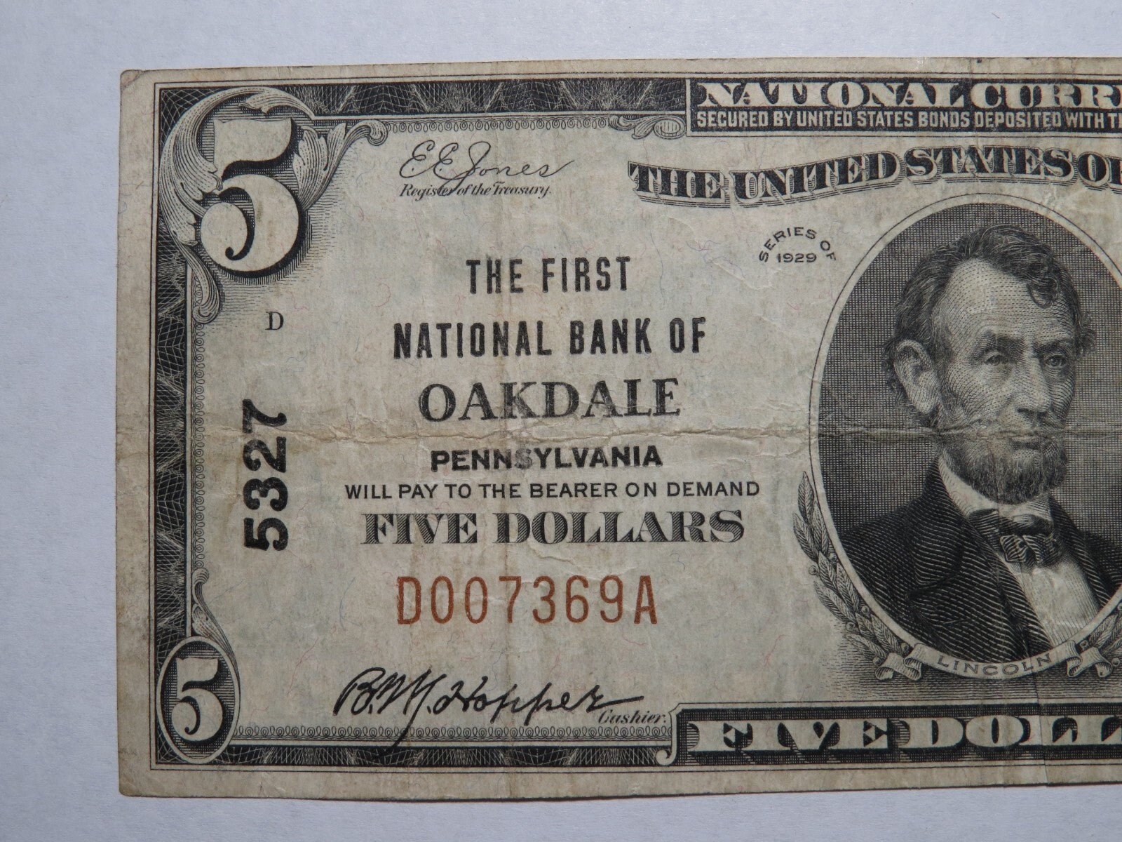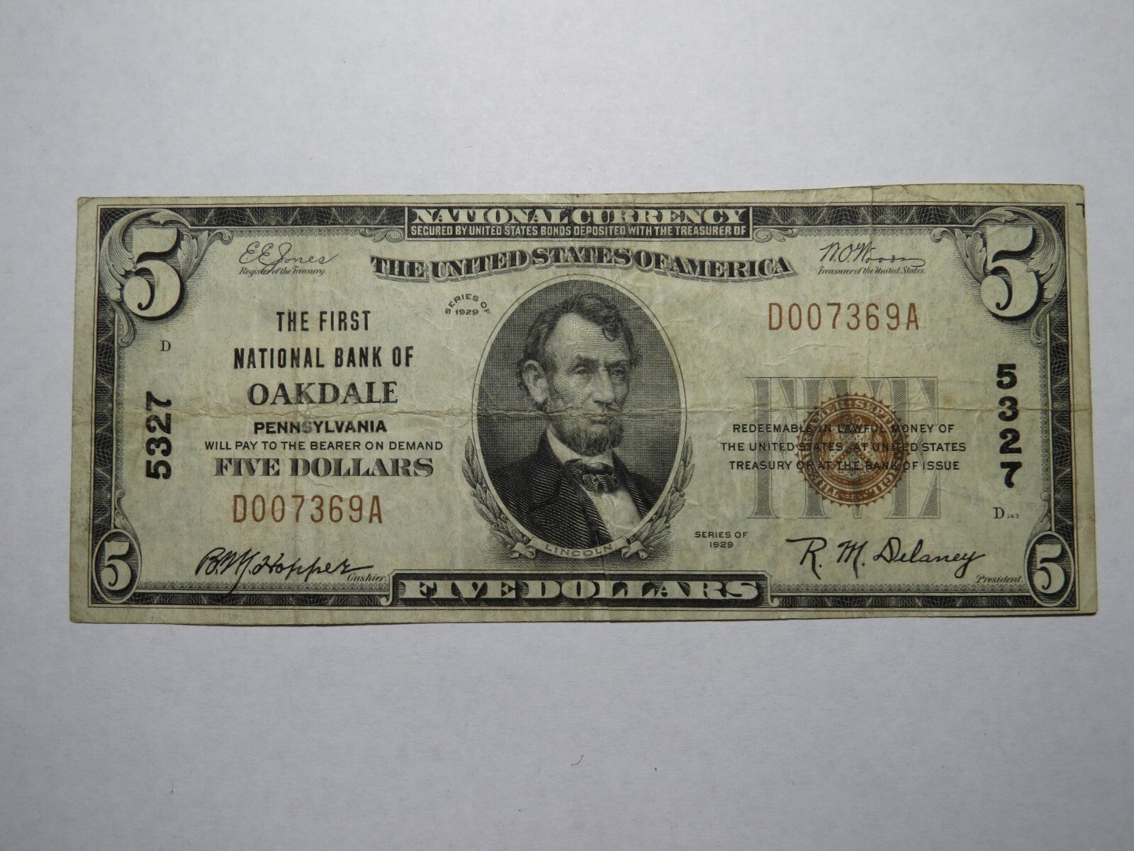 Up for auction is a $5 1929 Oakdale Pennsylvania Type 1 National Currency Note. This note was issued by The First National Bank of Oakdale. It is Charter #5327. This is a ONE BANK TOWN! This note has a good amount of crisp left to it and is in good shape with no issues. This bill is a must have for any collector of National Currency!