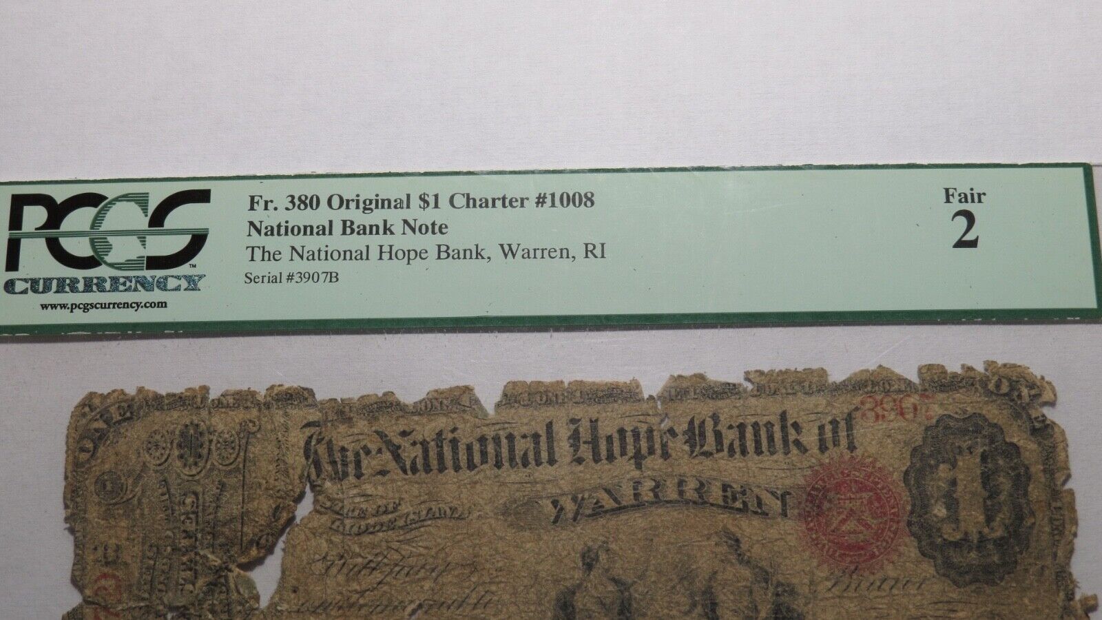 Up for auction is a $1 1865 Original Series Warren Rhode Island National Currency Note. It is issued from The National Hope Bank Of Warren. It is Charter #1008. There are only brown backs or original series notes available for this charter! Bill has been graded Fair 2 by PCGS. This note books for $2,500 in Kelly in Fine, I am offering it at less than half of that price because of the grade. You will not find this charter anywhere else anytime soon. This bill is a must have for any collector of National Currency!
