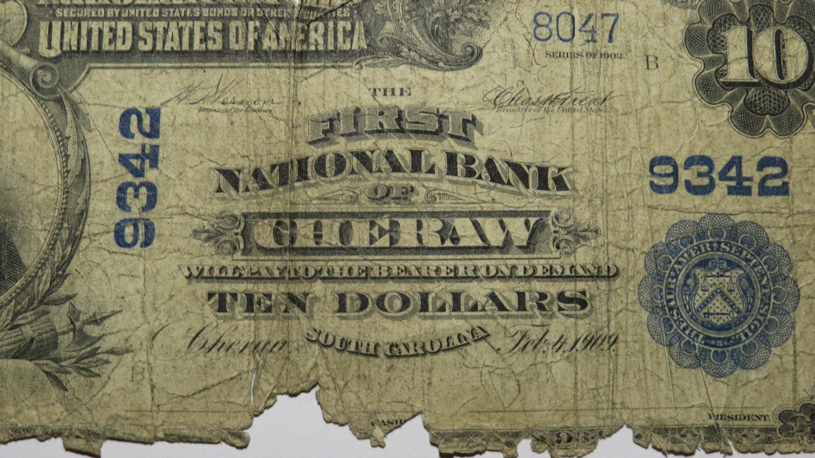 Up for auction is a $10 1902 Cheraw South Carolina Plain Back National Currency Note