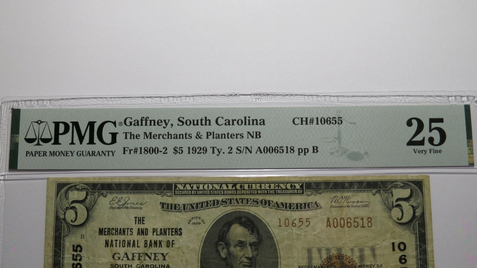 Up for auction is a $5 1929 Gaffney South Carolina Type 2 National Currency Note. It is issued from The Merchants and Planters National Bank of Gaffney. It is Charter #10655. Gaffney is a tough to find South Carolina town. This note has been graded Very Fine 25 by PMG. There is nothing wrong with this note. This bill is a must have for any collector of National Currency!