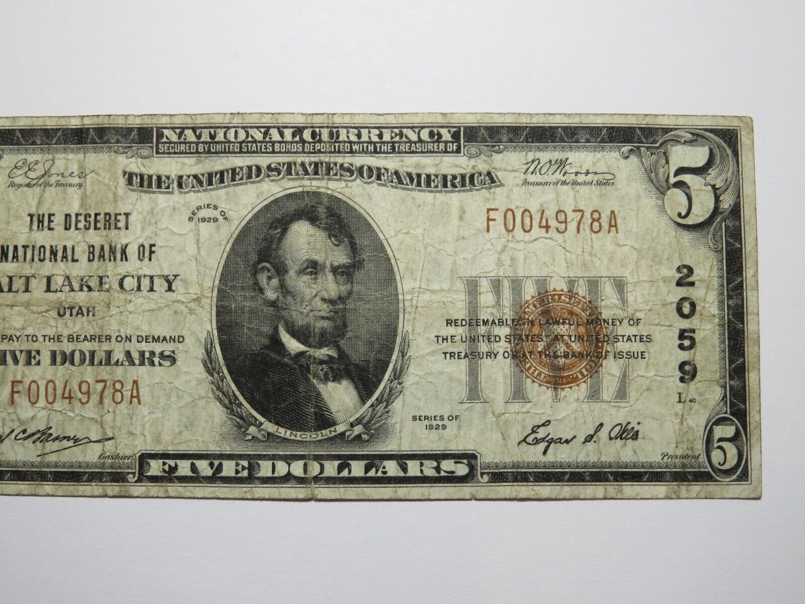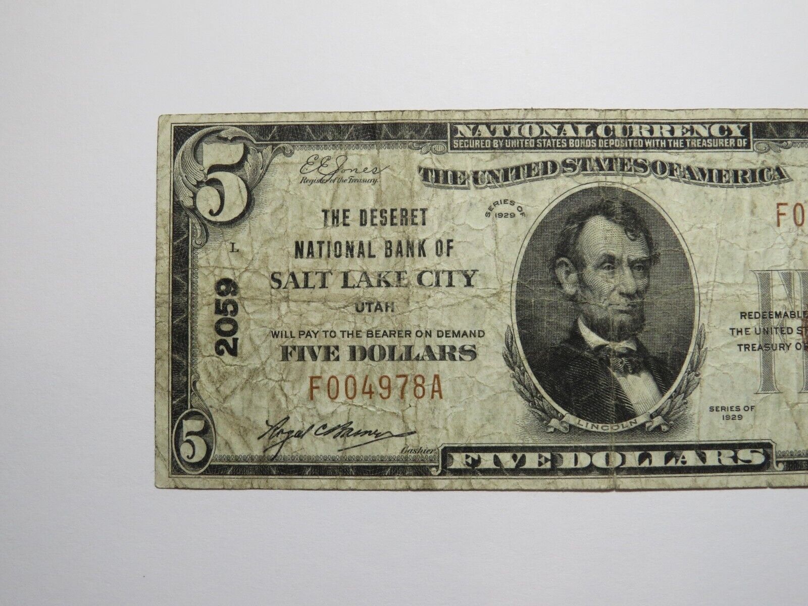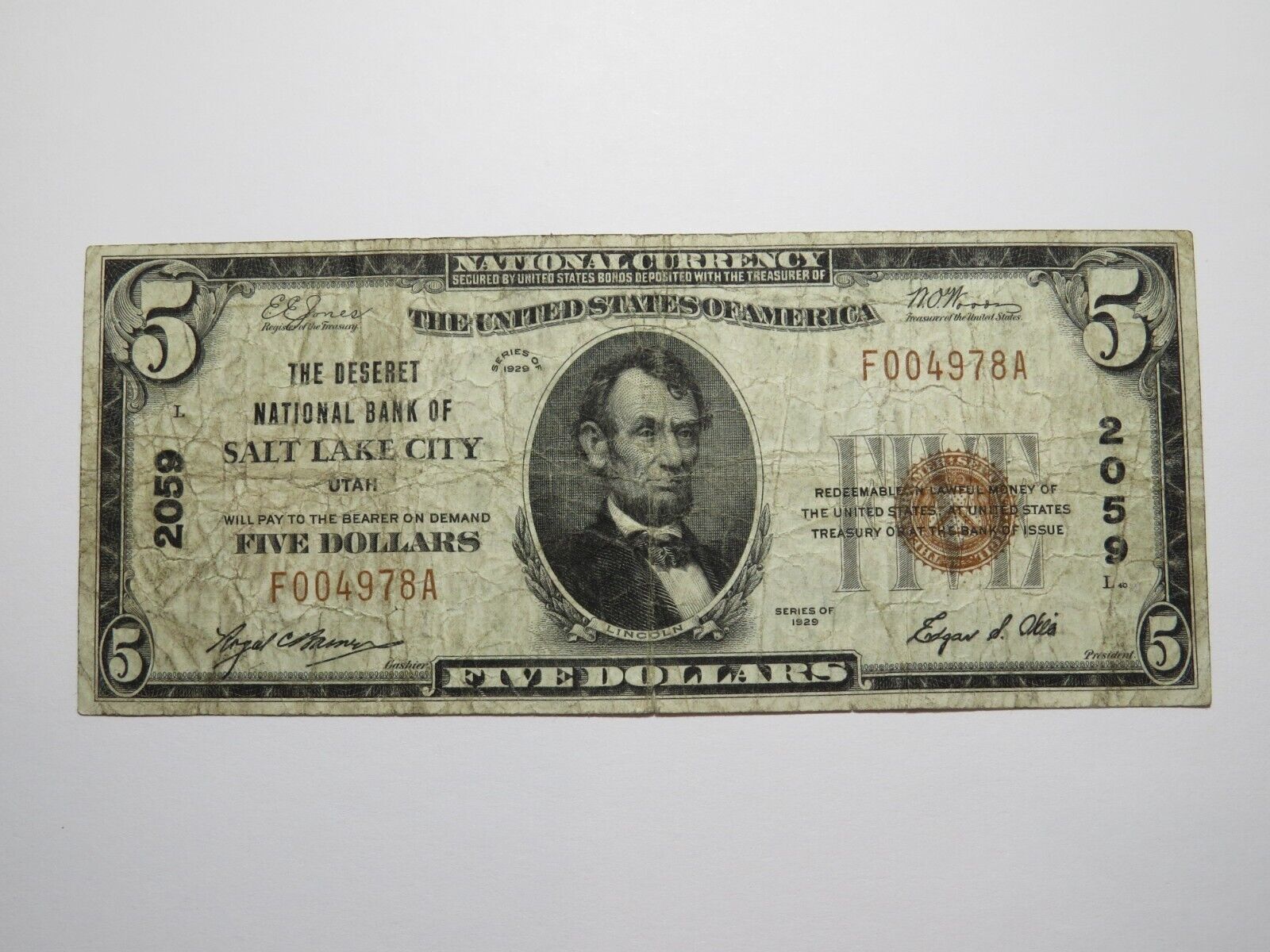 Up for auction is a $5 1929 Salt Lake City Utah Type 1 National Currency Note. This note was issued by The Deseret National Bank of Salt Lake City. It is Charter #2059. This is an always in demand Salt Lake City Charter! This note has a good amount of crisp left to it and is in good shape with no major issues. This bill is a must have for any collector of National Currency. If you have any questions please feel free to ask.