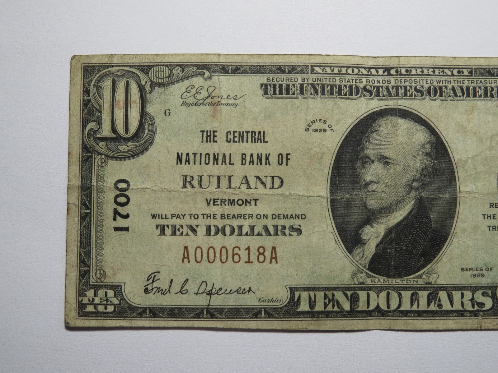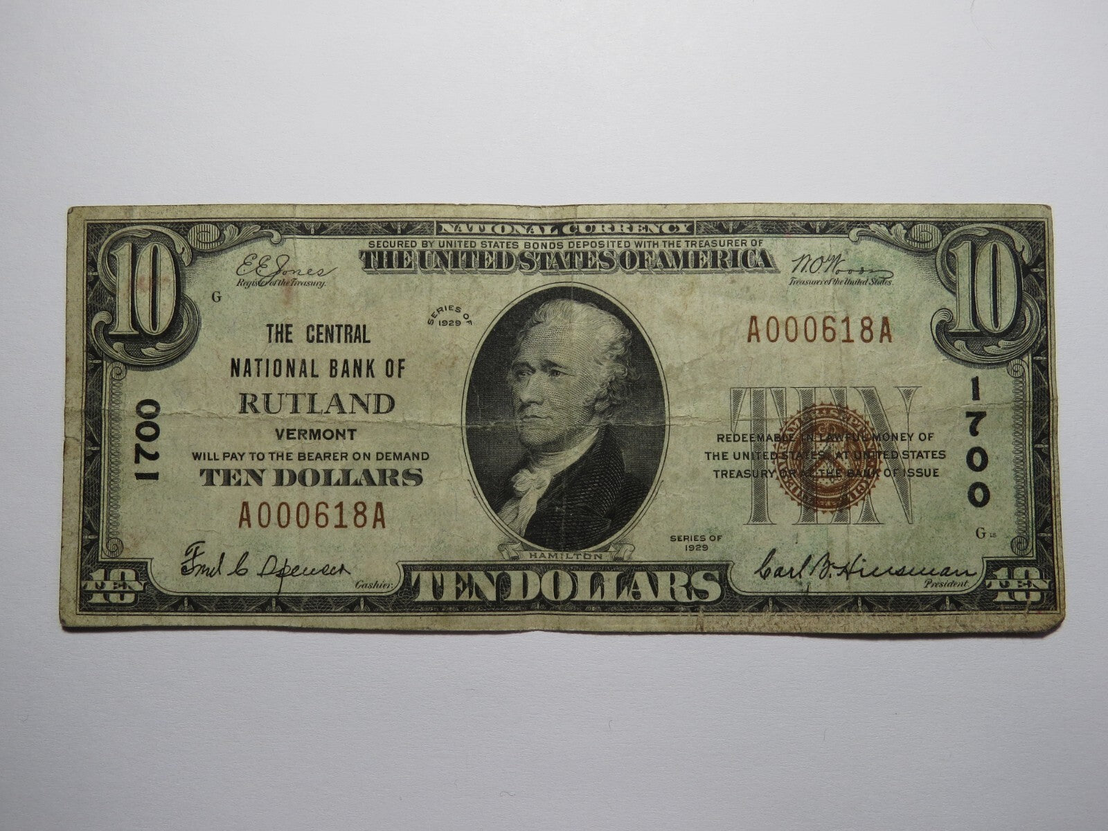 $10 1929 Rutland Vermont VT National Currency Bank Note Bill Charter #1700 FINE