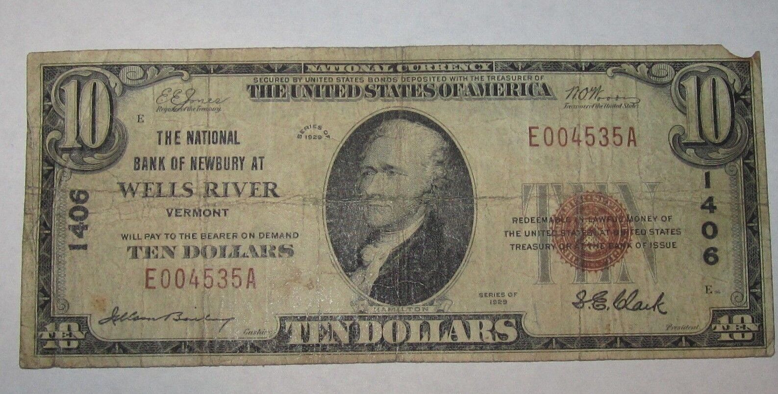 Up for auction is a $10 1929 Wells River Vermont Type 1 National Currency Note. It is issued from The National Bank Of Newbury At Wells River. It is Charter #1406. This note is extremely rare, and it is getting much harder to find this type of bill! I'm not a professional grader, but the pictures are very clear so that should give you a good idea of what to expect. This note has some good crisp left to it and is in good shape! There is a small piece out of the top right corner but it is not bad at all! This is a great bill! This bill is a must have for any collector of National Currency!