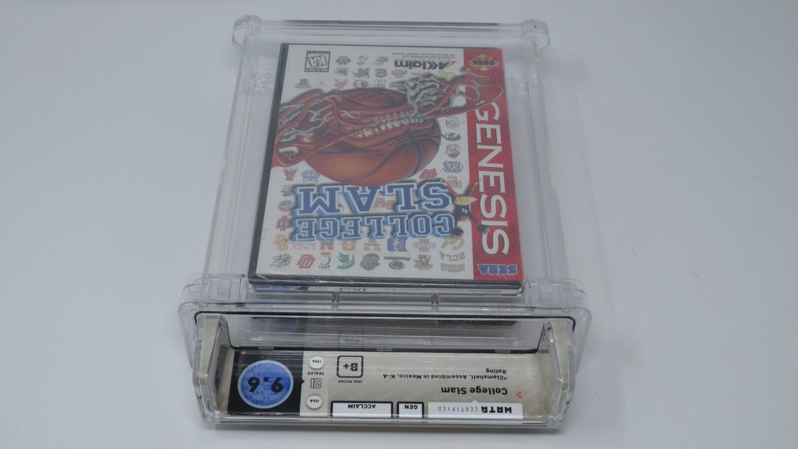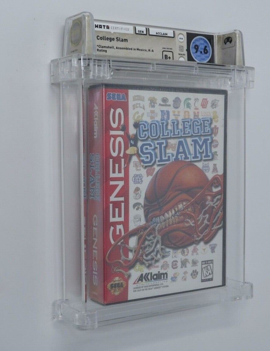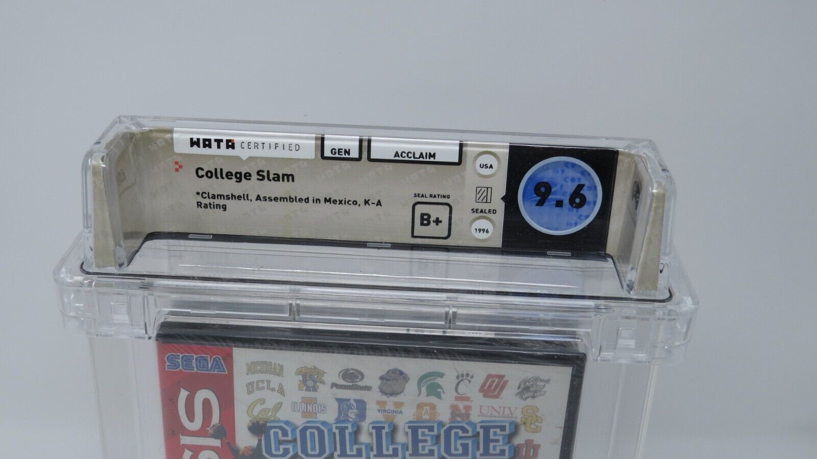 Up for auction is a College Slam Sega Genesis Sealed Video Game.  This sealed game has been graded a 9.6 by Wata.  The seal on the game was graded an B+.  This is the highest graded copy in the population report for this title.  This is a great chance to pick up a classic game.  If you have any questions please feel free to ask!