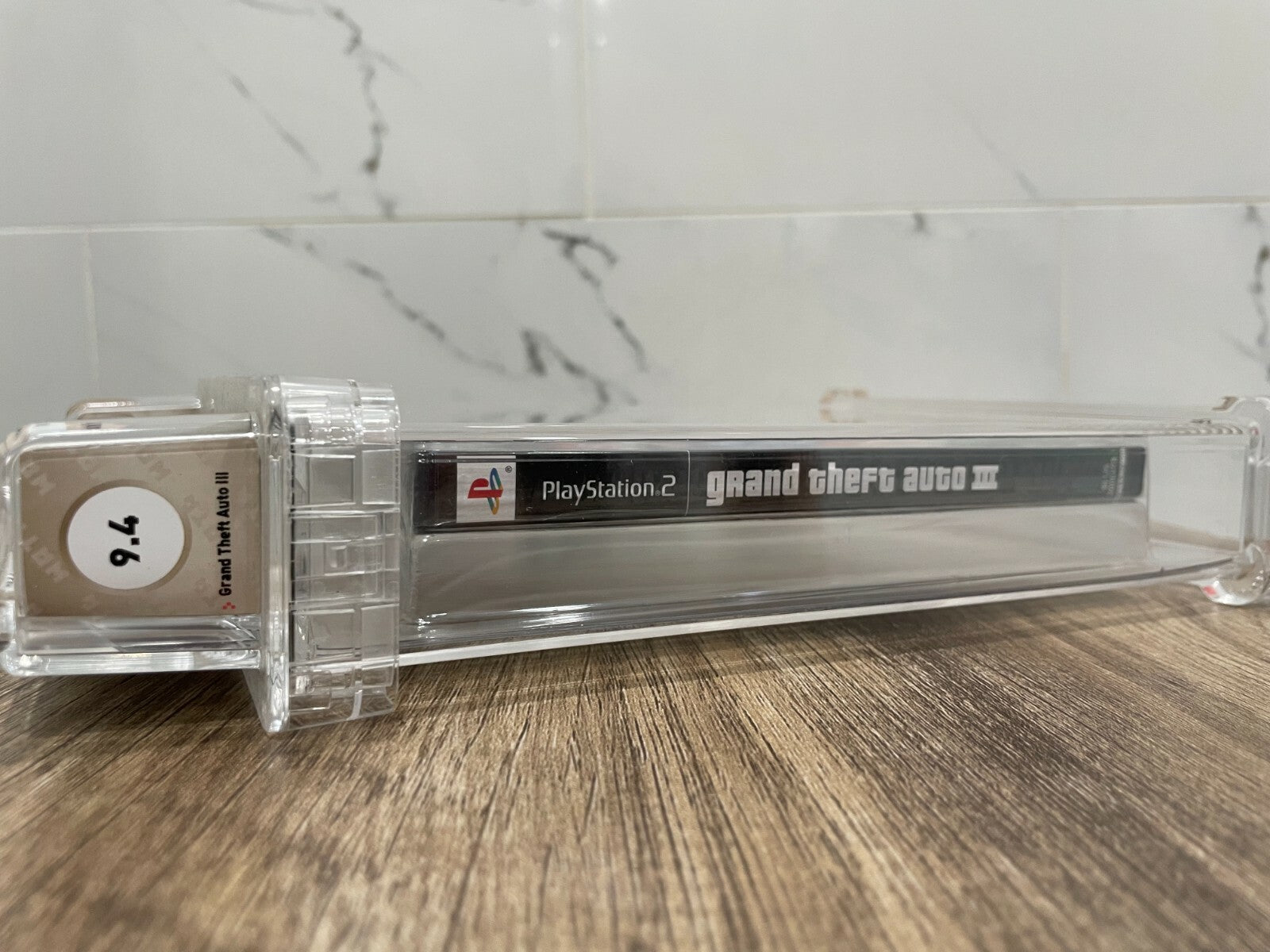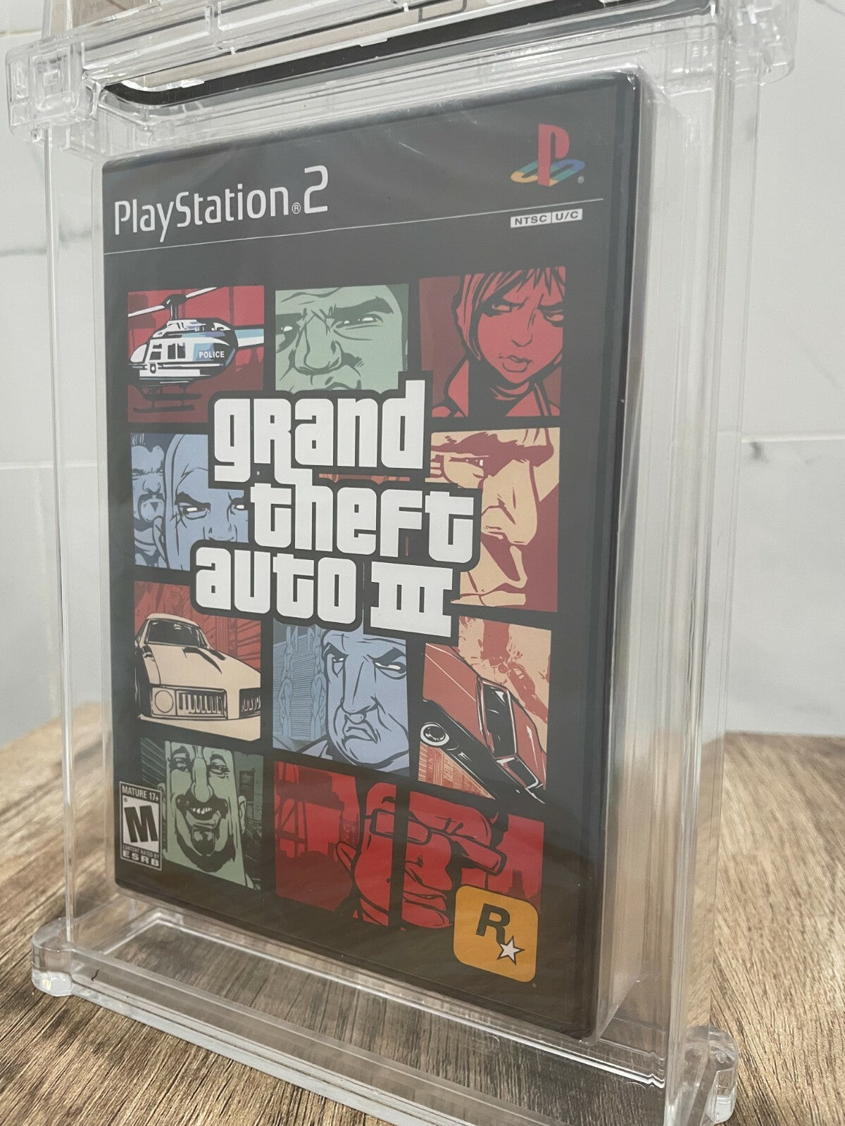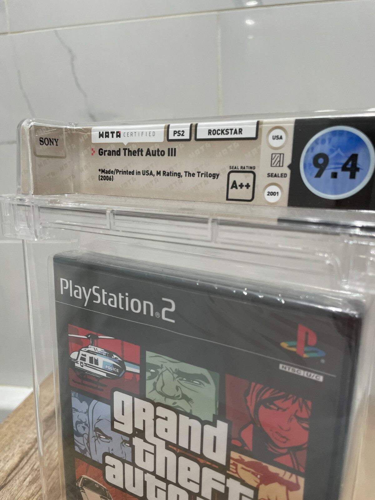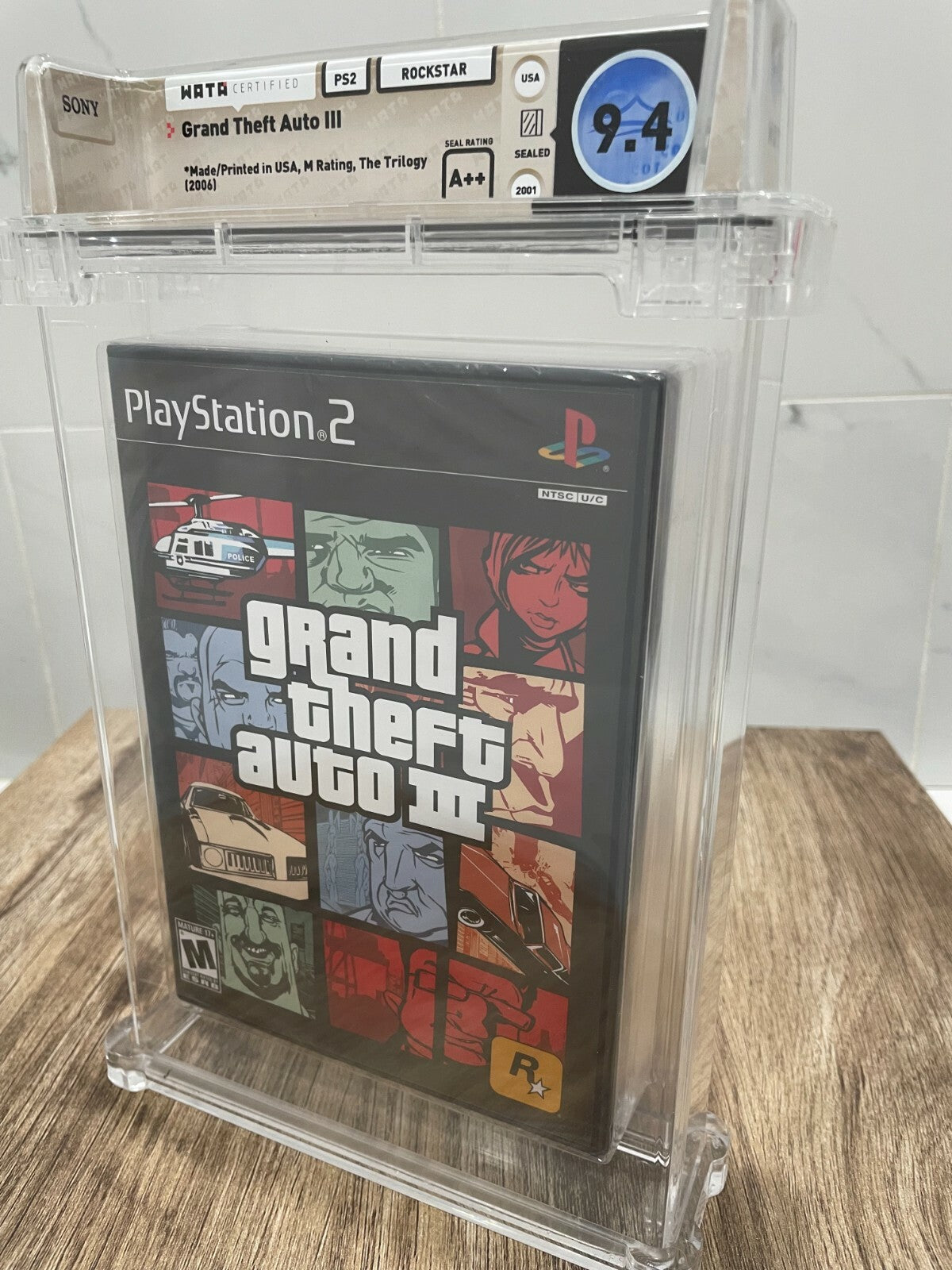 Up for auction is an Original Grand Theft Auto 3 Sony Playstation 2 Sealed Video Game. This sealed game has been graded a 9.4 by Wata. The seal on the game was graded an A++. This is version was part of the GTA Trilogy Set. GTA III was the 4th best selling PS2 game of all time! This is a great chance to pick up a classic Playstation game!