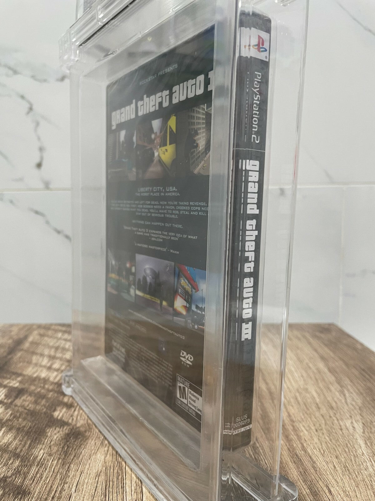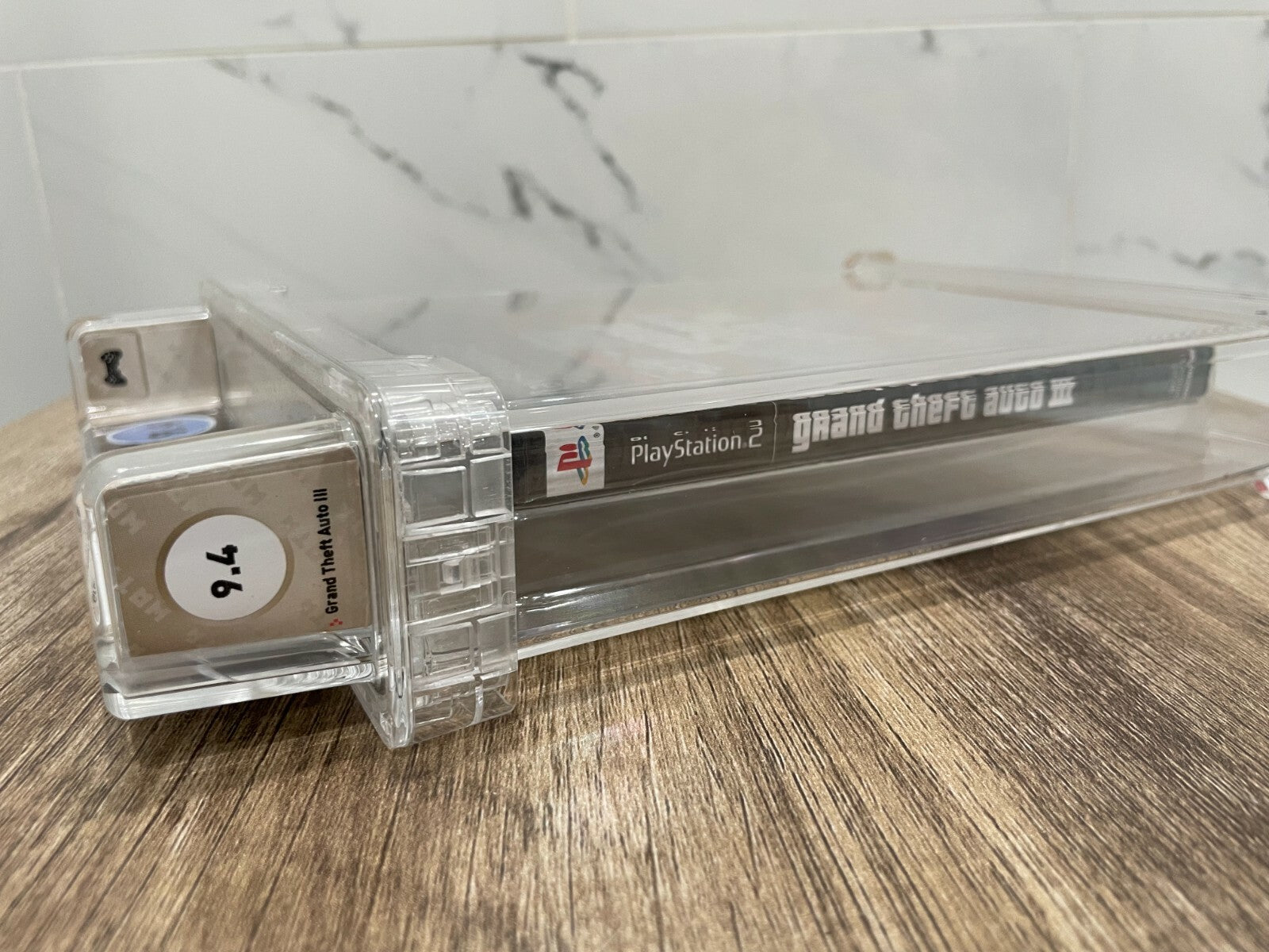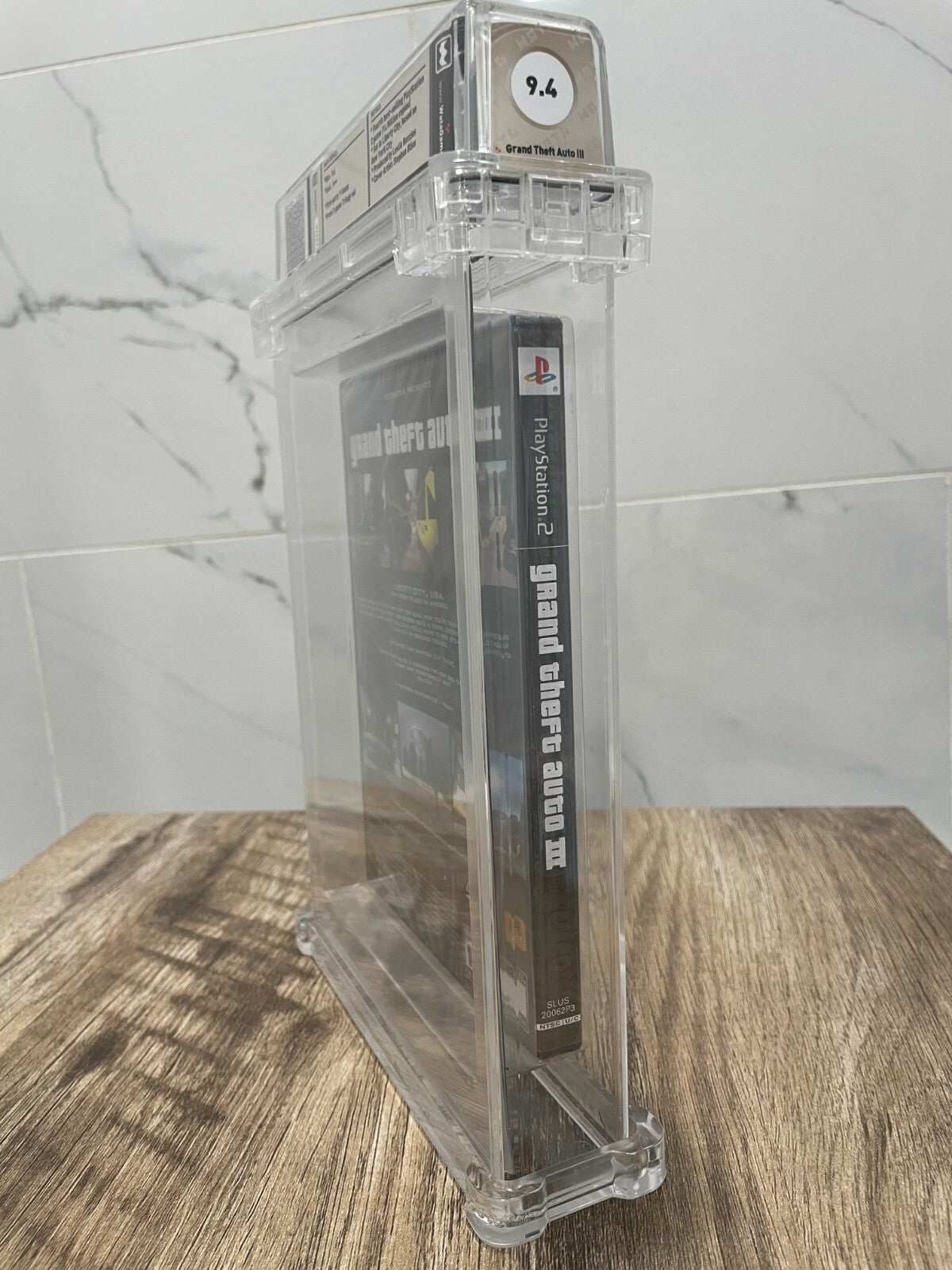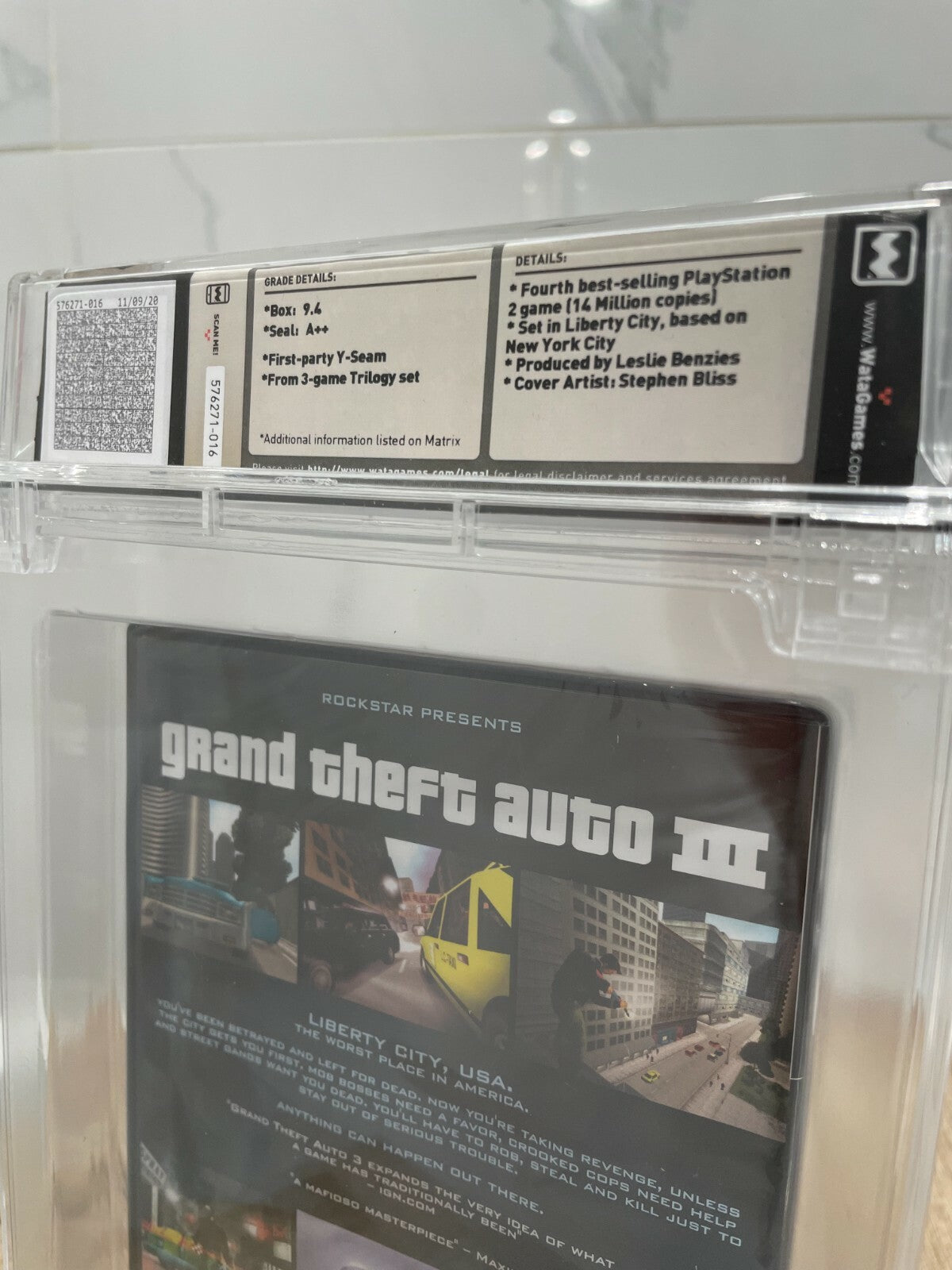 Up for auction is an Original Grand Theft Auto 3 Sony Playstation 2 Sealed Video Game. This sealed game has been graded a 9.4 by Wata. The seal on the game was graded an A++. This is version was part of the GTA Trilogy Set. GTA III was the 4th best selling PS2 game of all time! This is a great chance to pick up a classic Playstation game!