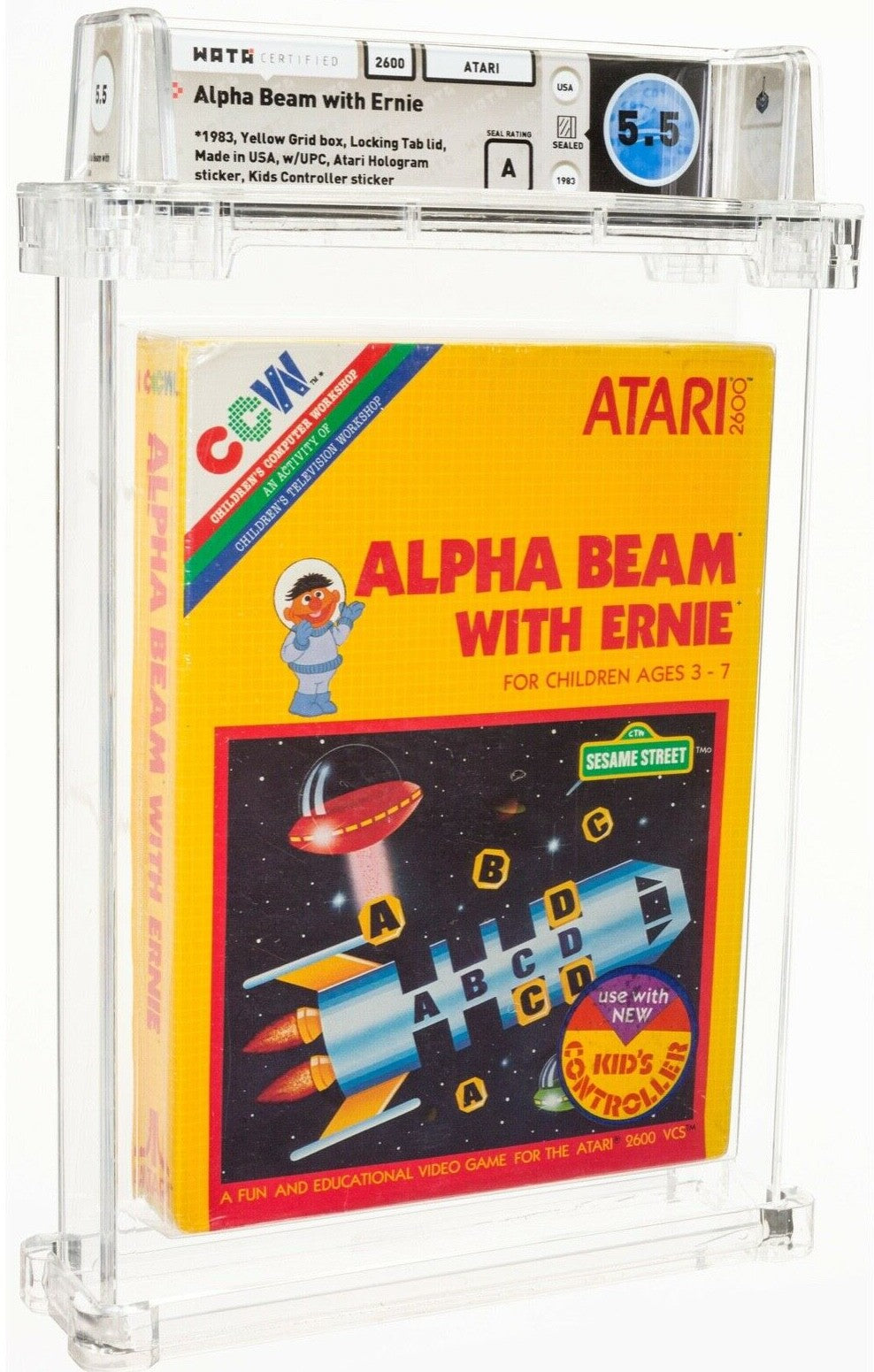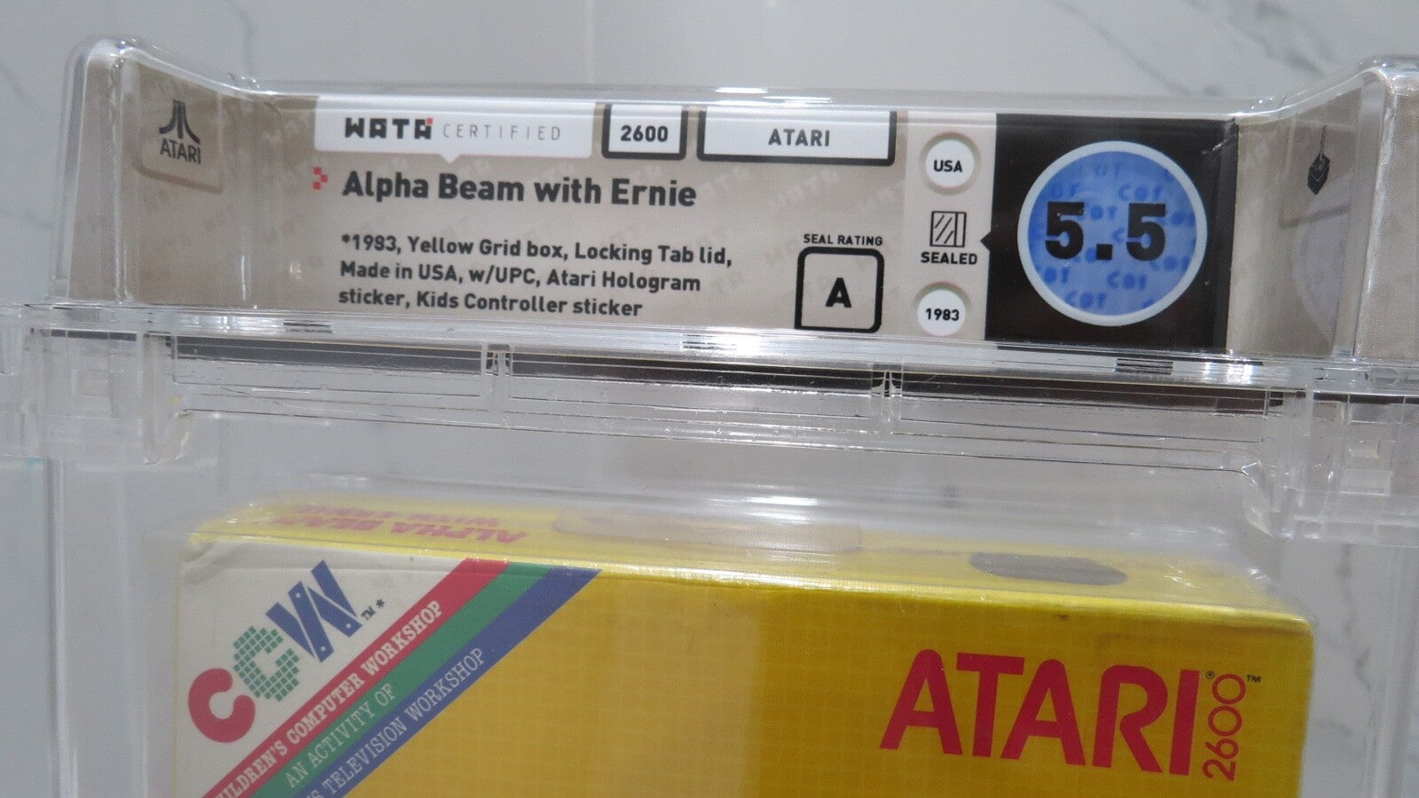 Up for auction is an Unopened Alpha Beam With Ernie Atari Video Game. This game was for Atari and was released in 1983. This game has been graded a 5.5 by Wata. The seal received an A Grade. This is a tough to find game. This is a great chance to pick up an Atari classic!