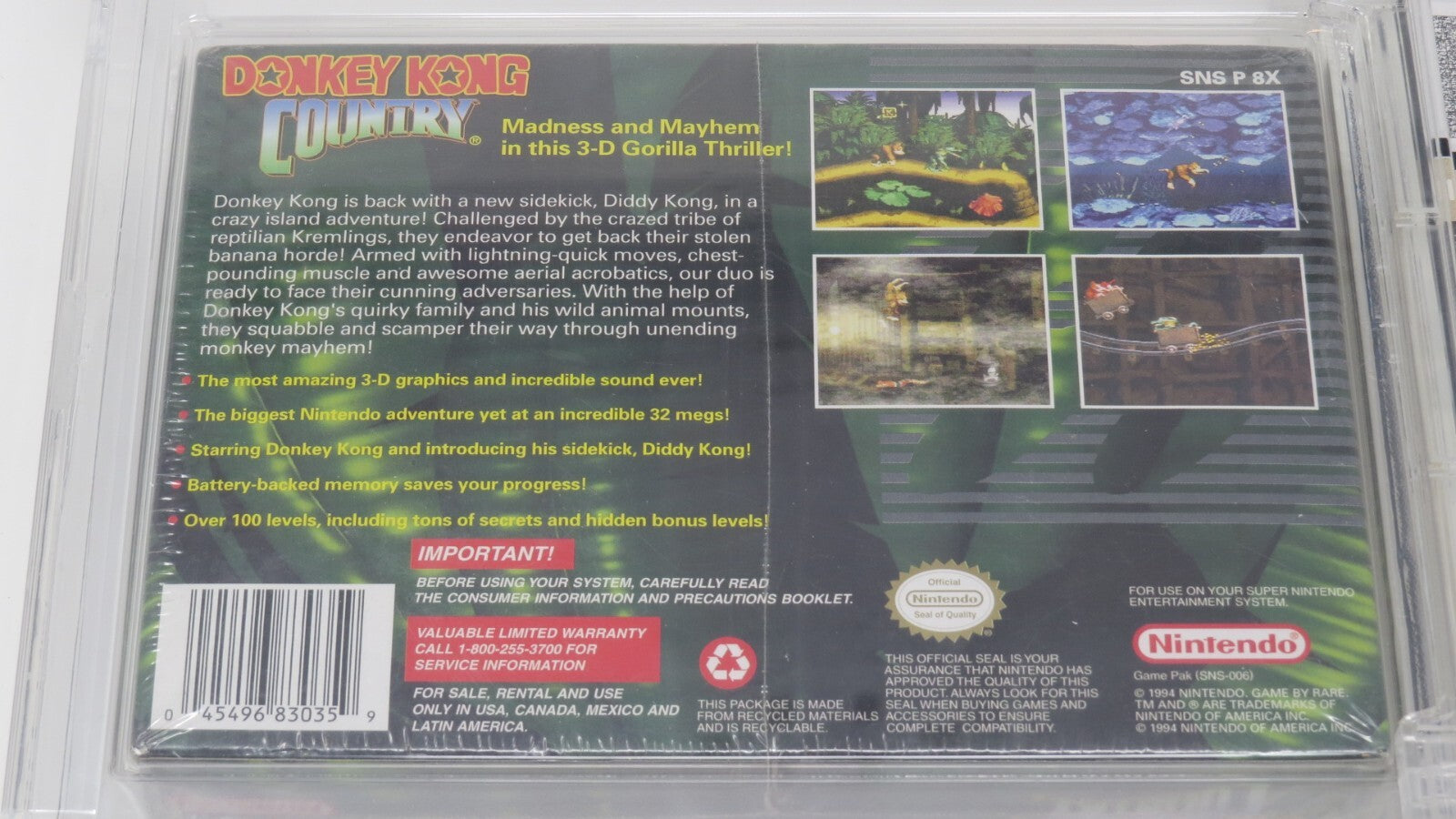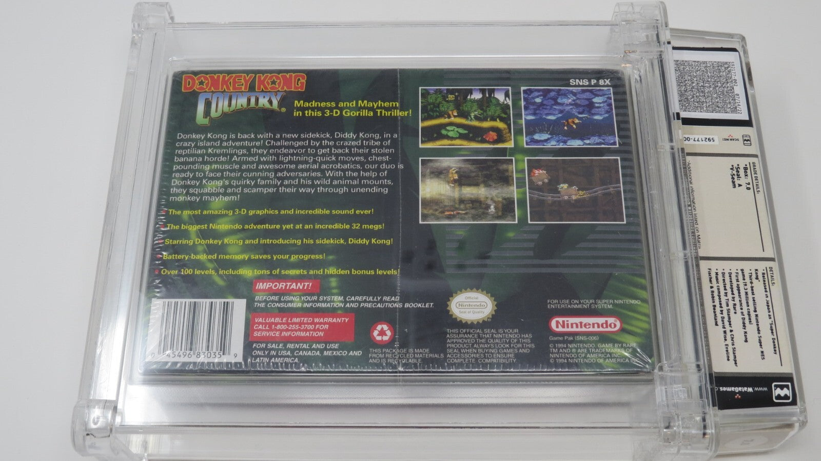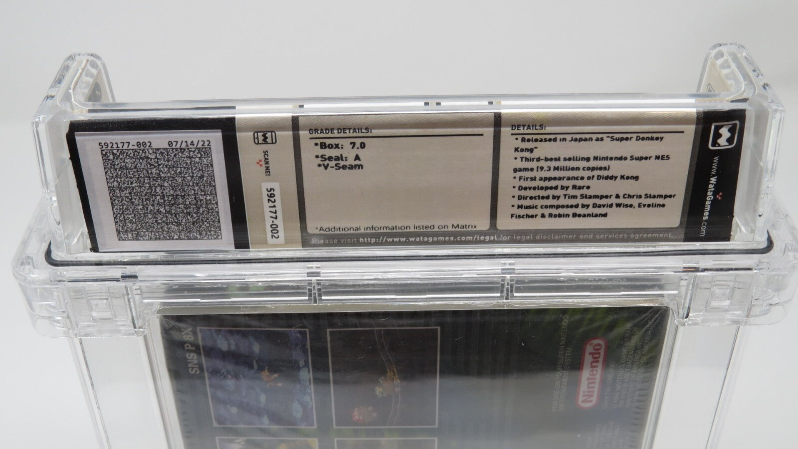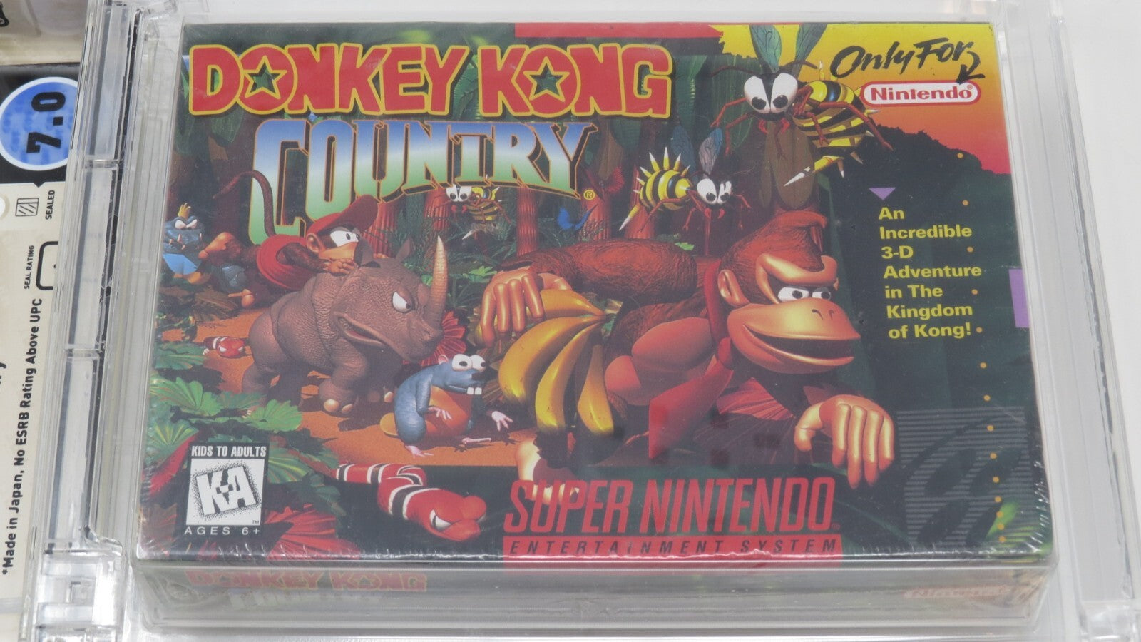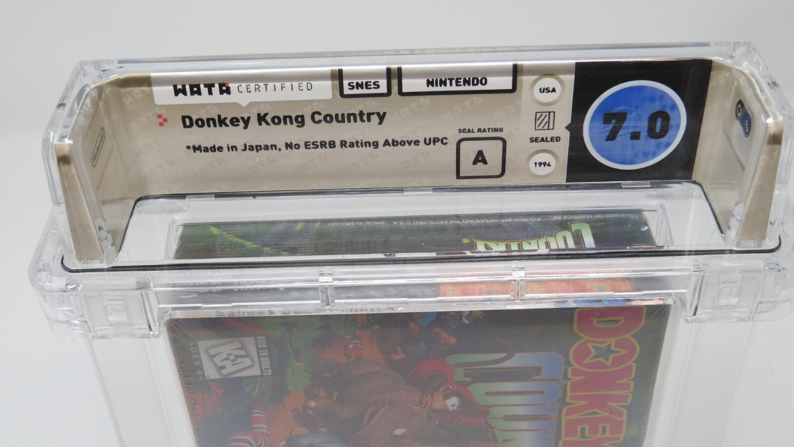 Up for auction is a Donkey Kong Country Super Nintendo Factory Sealed Video Game. This game has been graded a 7.0 by Wata. The seal on this game was graded an A. This is the original version of the game. Donkey Kong Country was the third best selling Super Nintendo game of all time. This is a great chance to pick up a classic!