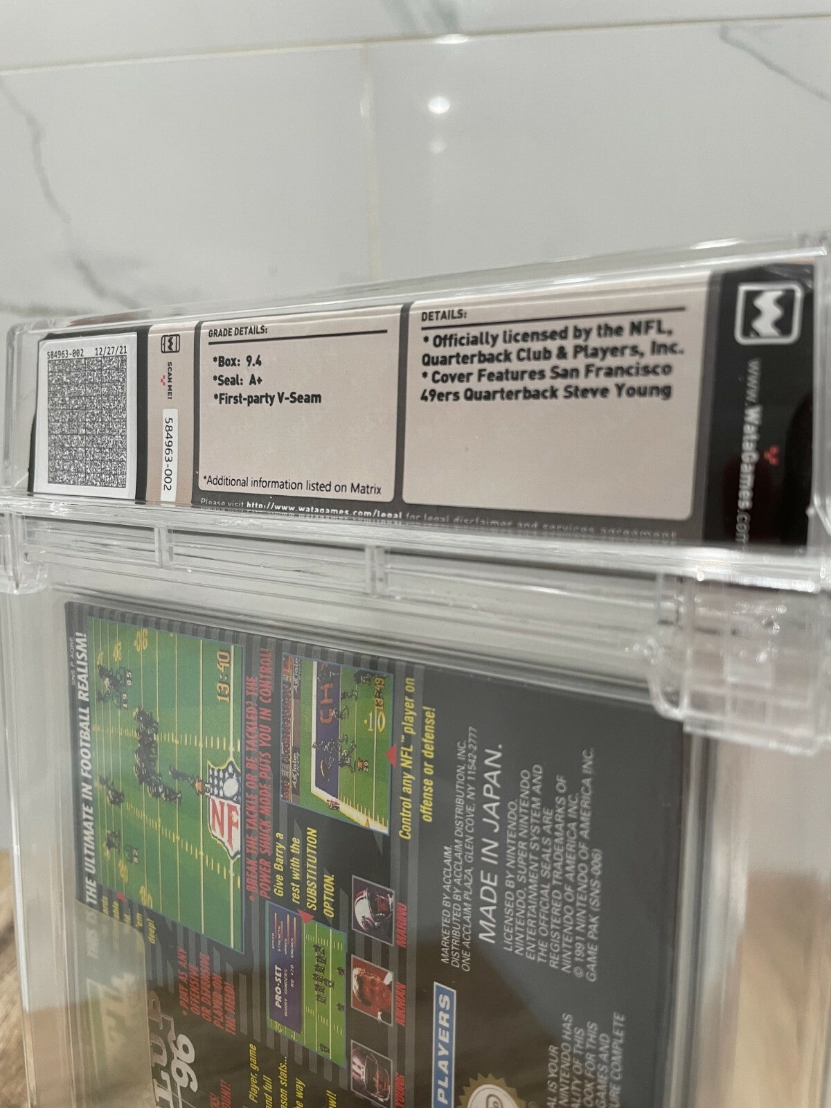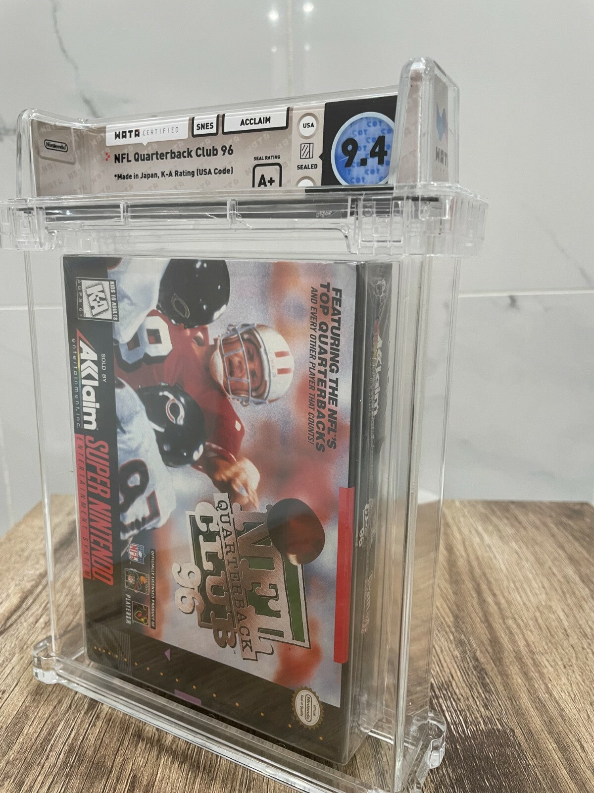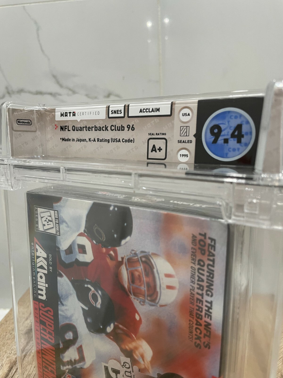 Up for auction is an Original NFL Quarterback Club '96 Super Nintendo Sealed Video Game.  This sealed game has been graded a 9.4 by Wata.  The seal on the game was graded an A+.  The game has Wata's Deep Seal Badge which is only available for games that grade above a 9.0.  This is a great chance to pick up a classic sports game!