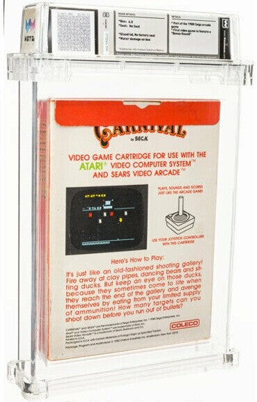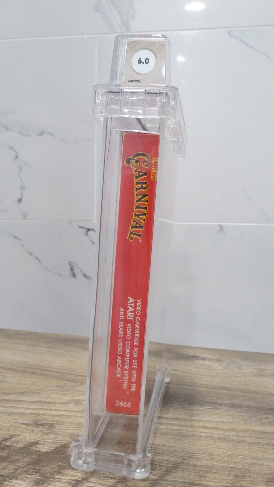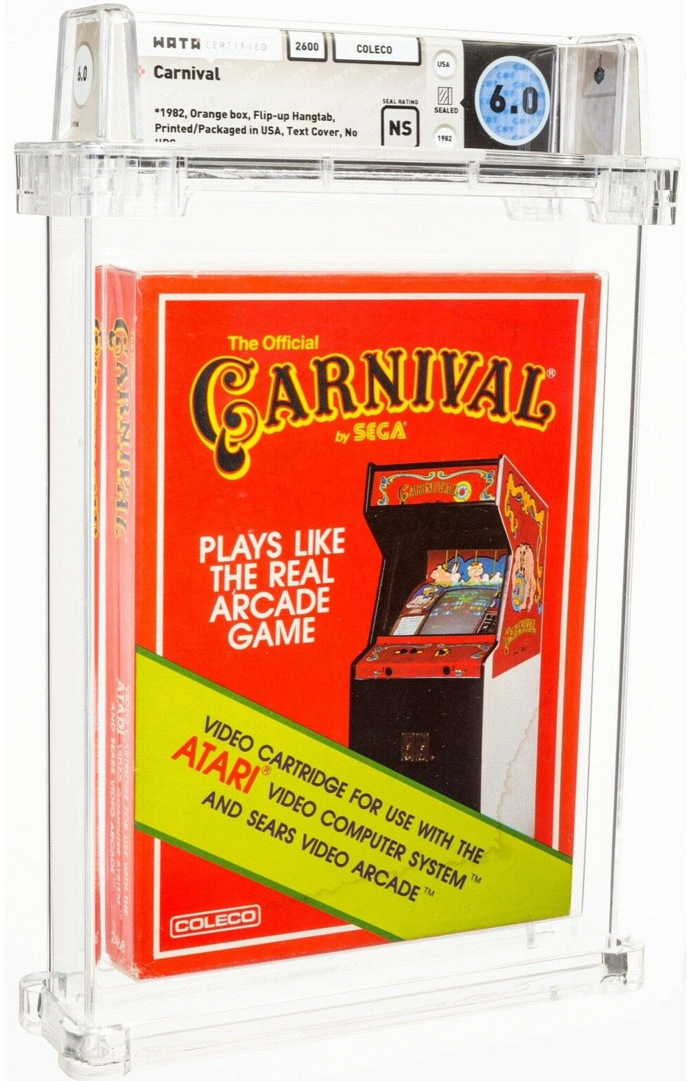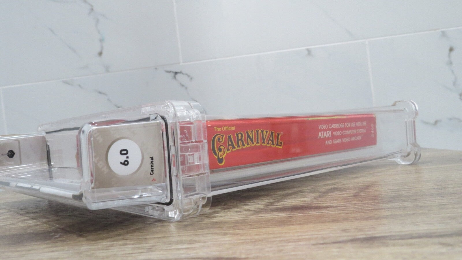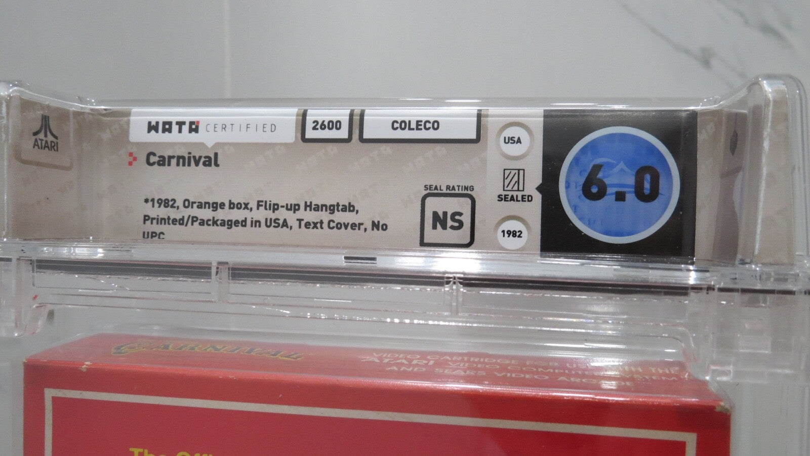 Up for auction is an Unopened Carnival by Coleco Atari Video Game. This game was for Atari and was released in 1982. This game was manufactured without a seal and is in unopened condition. This game has been graded a 6.0 by Wata. This is a tough to find game with its claim to fame being the first ever video game to feature a bonus round. This is a great chance to pick up an Atari classic!