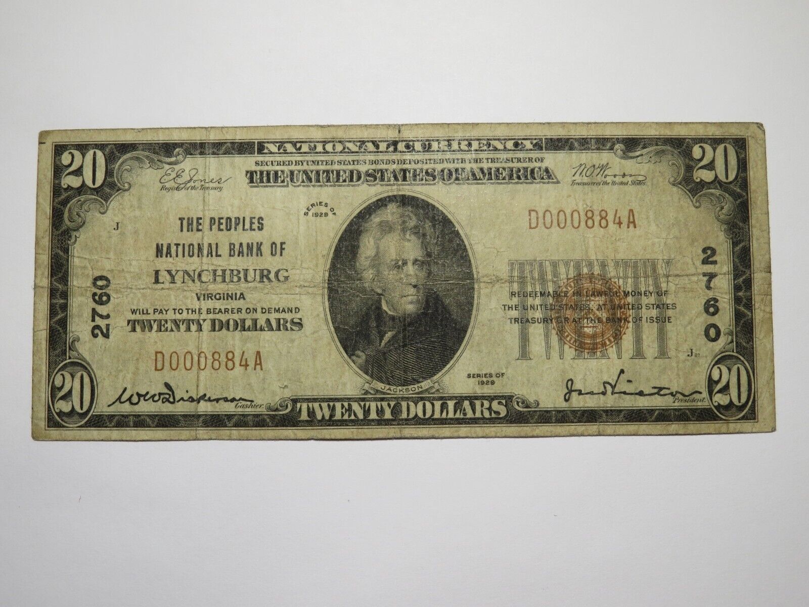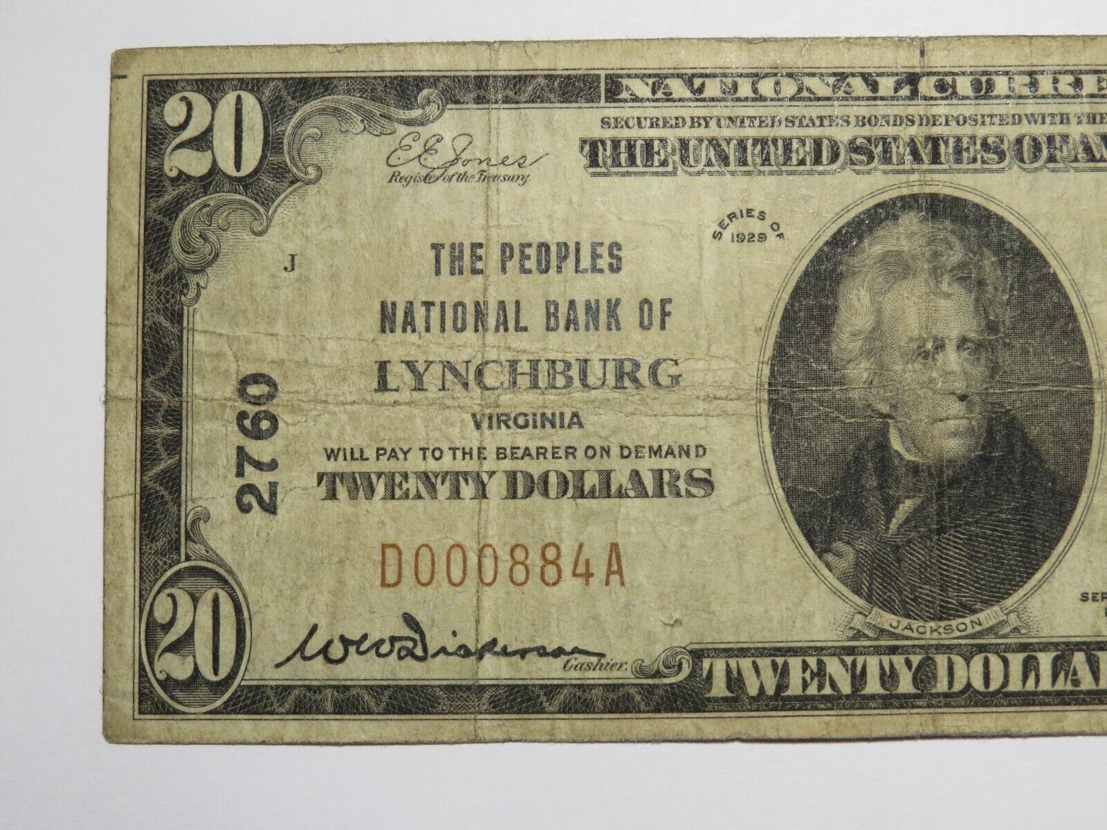 Up for auction is a $20 1929 Lynchburg Virginia Type 1 National Currency Note. This note was issued by The Peoples National Bank of Lynchburg. It is Charter #2760. Lynchburg is an always in demand Virginia town. This note still has some crisp left to it and is in good shape with no issues. This bill is a must have for any collector of National Currency!