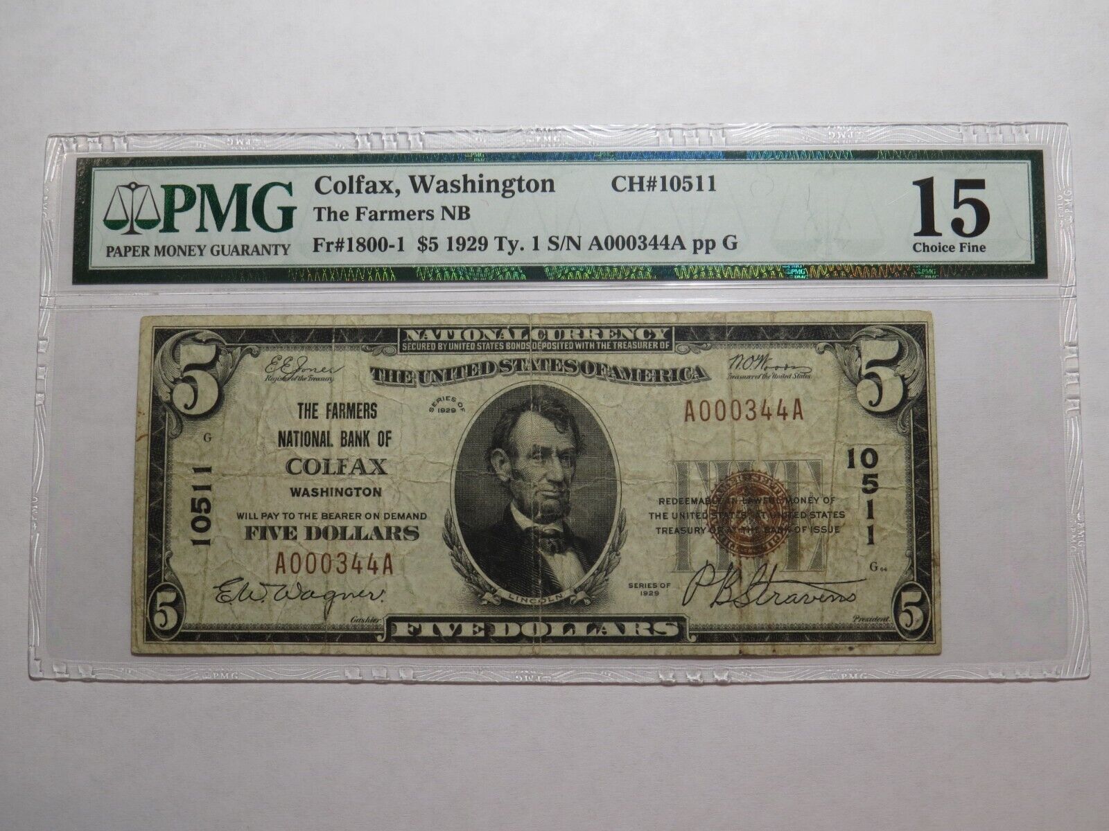 Up for auction is a $5 1929 Colfax Washington Type 1 National Currency Note. This note was issued by The Colfax National Bank. It is Charter #10511. Colfax is a tough to find Washington town! This note has been graded Choice Fine 15 by PMG. This is a problem free note. This bill is a must have for any collector of National Currency!