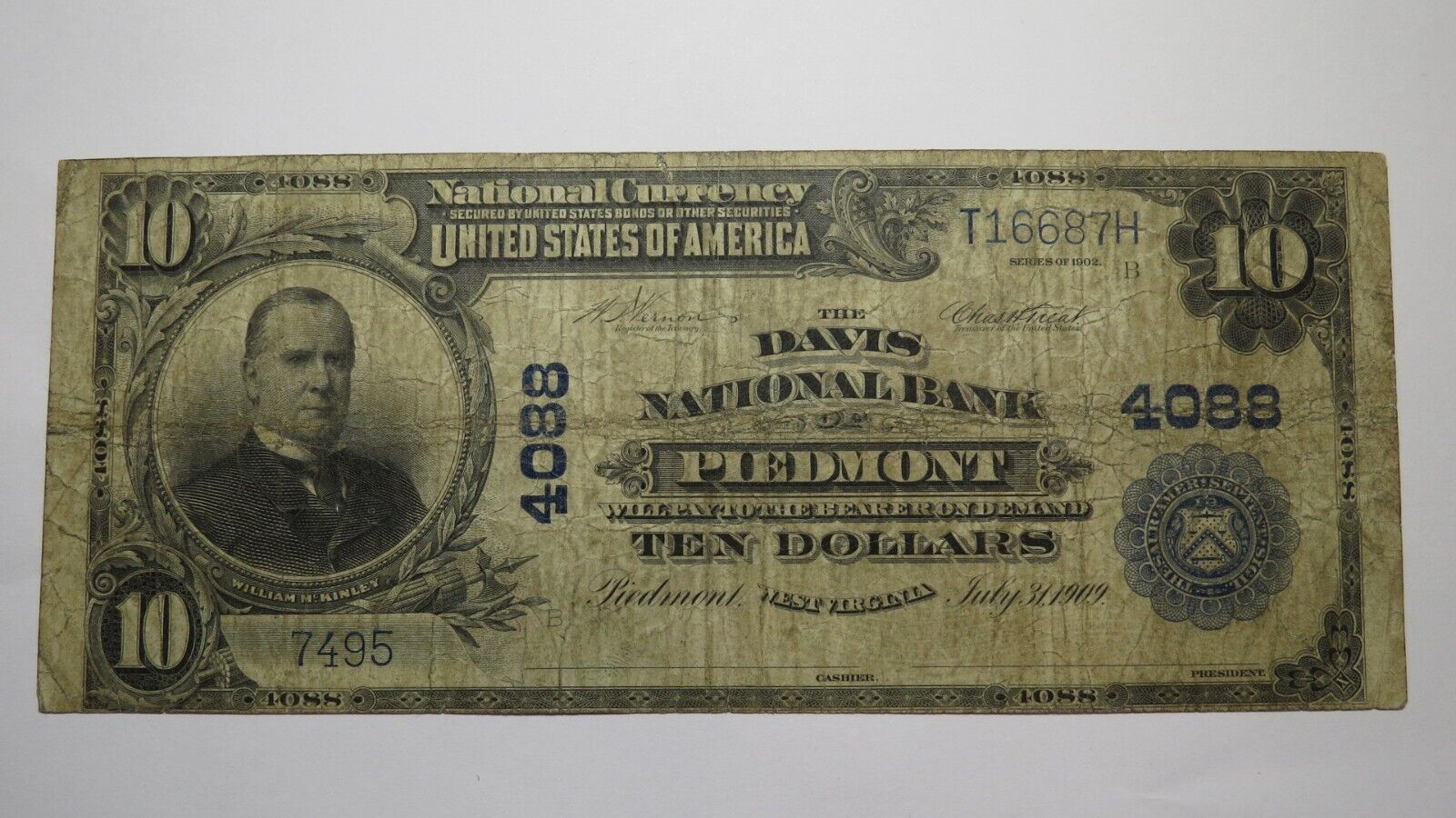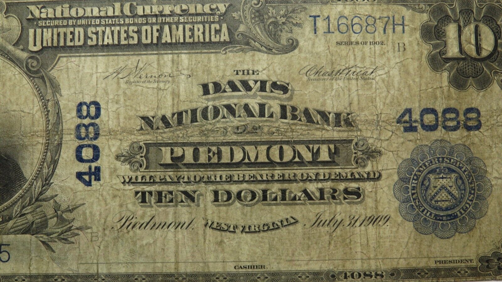 Up for auction is a $10 1902 Piedmont West Virginia Plain Back National Currency Note. This note was issued by The Davis National Bank of Piedmont. It is Charter #4088. This is an incredibly hard Piedmont Charter to find! This bill still has some crisp left to it and is in good shape with no major issues. This bill is a must have for any collector of National Currency!