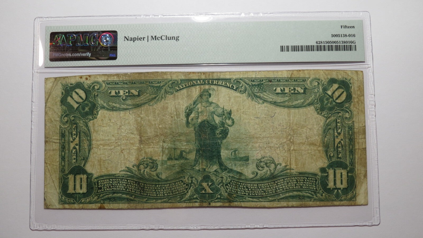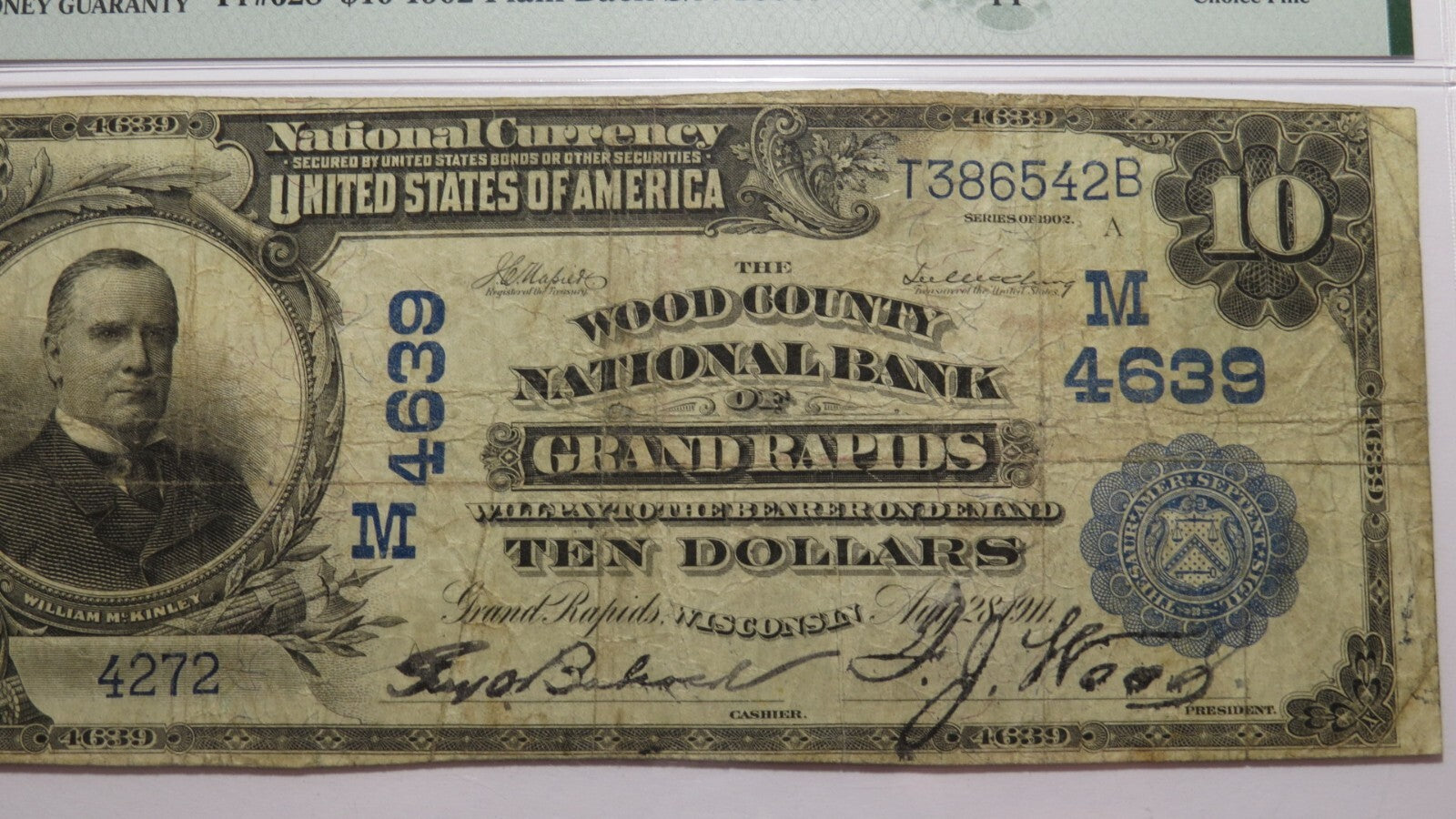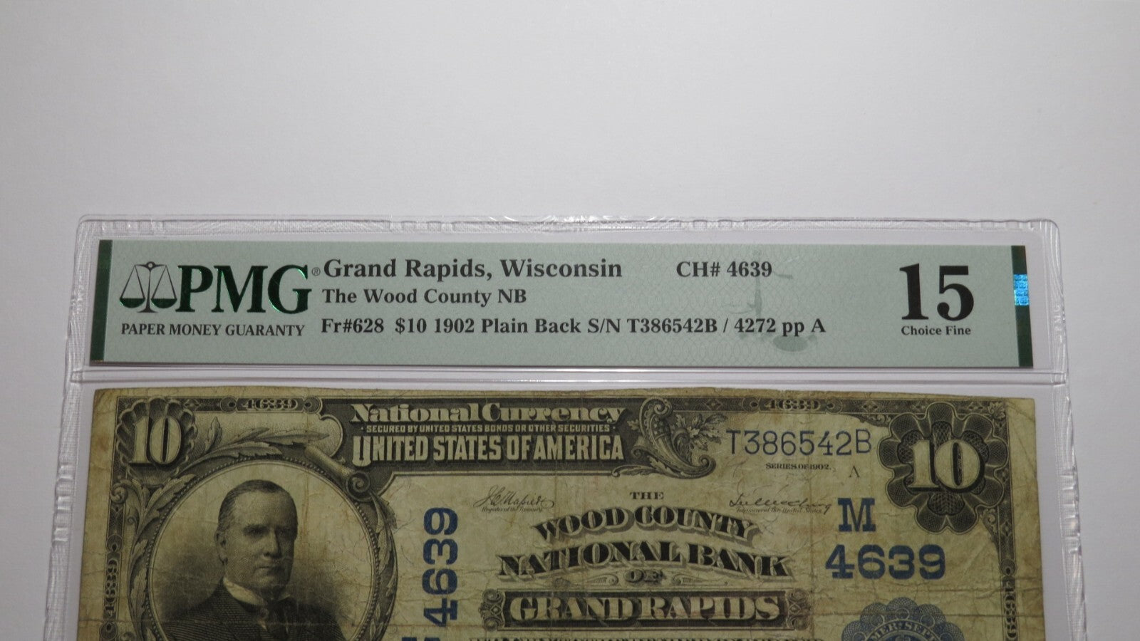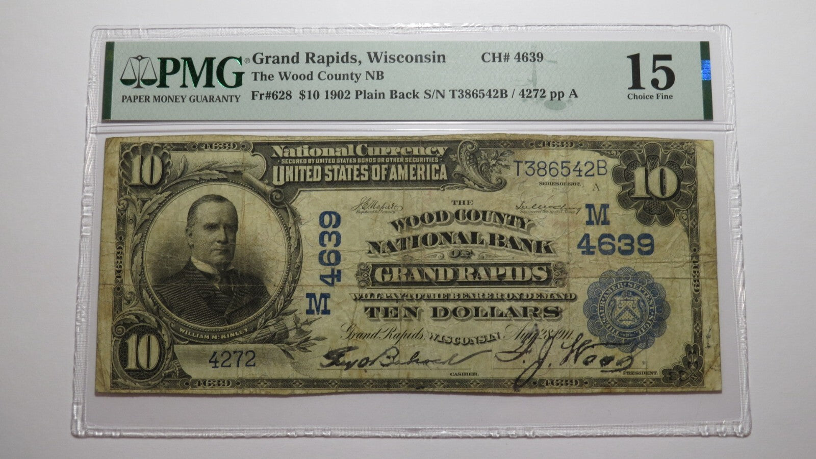 Up for auction is a $10 1902 Grand Rapids Wisconsin National Currency Note. This note was issued from The Wood County National Bank of Grand Rapids. It is Charter #4639. Grand Rapids is a tough to find town in Large Size notes! This bill has been graded Choice Fine 15 by PMG. There is nothing wrong with this note. This bill is a must have for any collector of National Currency!