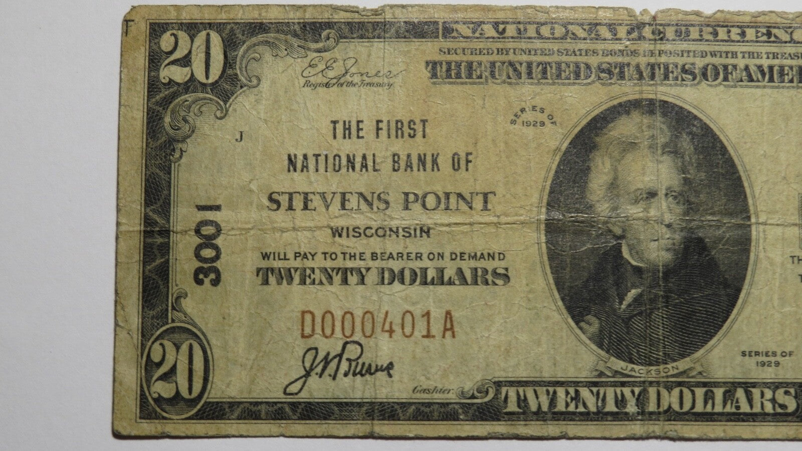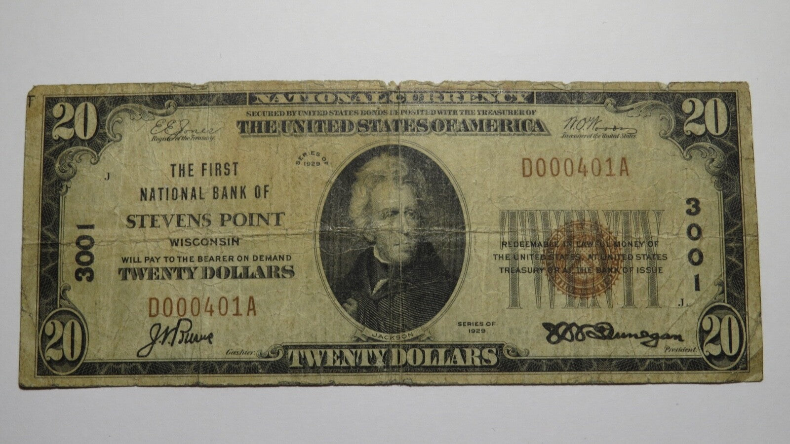 Up for auction is a $20 1929 Stevens Point Wisconsin National Currency Note. It is issued from The First National Bank of Stevens Point. It is Charter #3001. Stevens Point is an always in demand Wisconsin town! This note still has some good crisp left to it and is in good shape. This note does have a rough upper margin, that is the only flaw. This bill is a must have for any collector of National Currency!