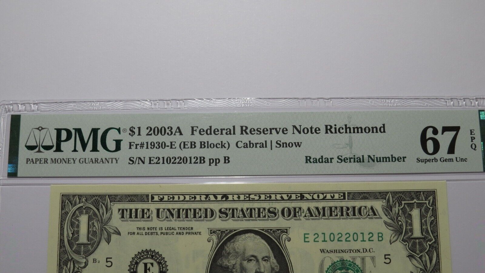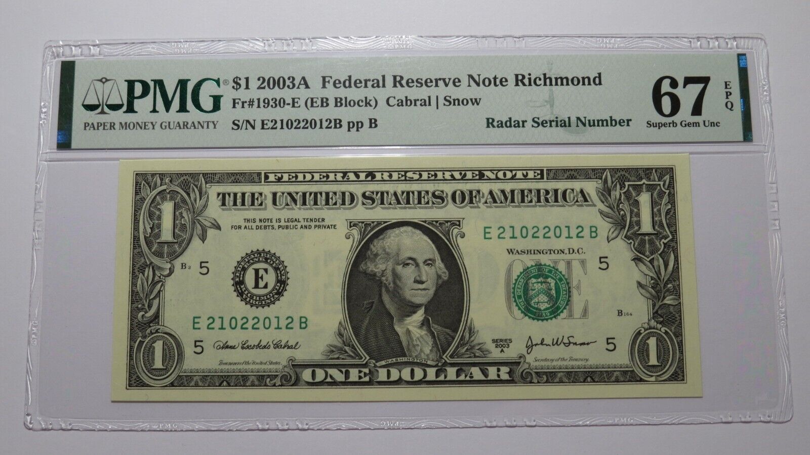 Up for auction is a $1 2003-A Radar Serial Number Federal Reserve Note. This note was issued by the Federal Reserve Bank of Richmond. This note has a Radar Serial Number (same number forwards and backwards). This note has been graded Superb Gem Uncirculated 67EPQ by PMG. There is absolutely nothing wrong with this note! This note is a must have for any collector of Federal Reserve Notes!