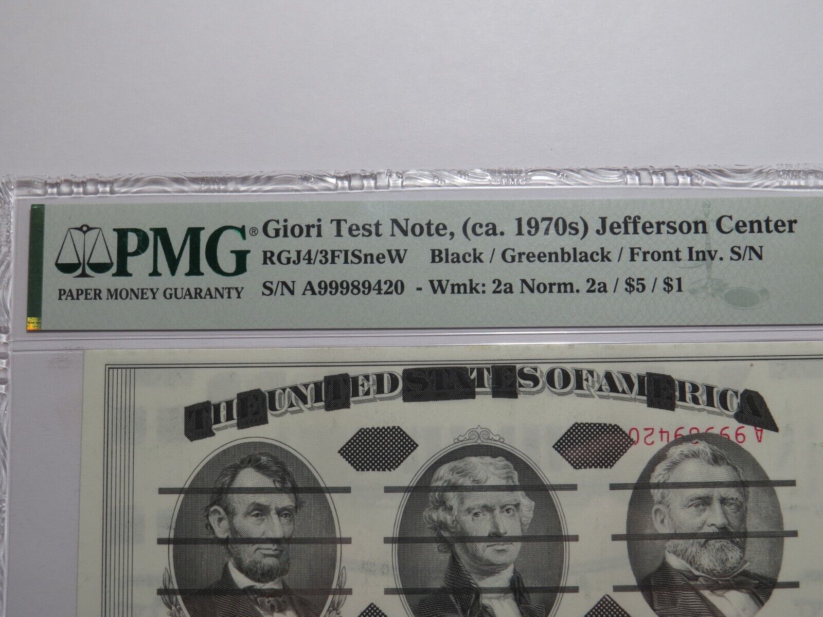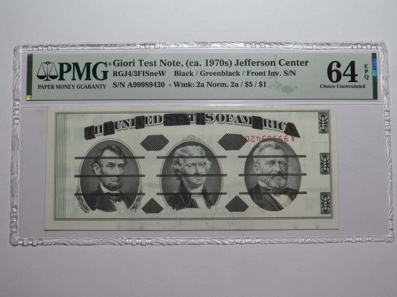 Up for auction is a 1970's Jefferson Giori Test Note. This note has an inverted serial number and is printed on watermark paper. This note has been graded Choice Uncirculated 64EPQ by PMG. There is absolutely nothing wrong with this note! Giori Test Notes with the serial number are tough to find! This note is a must have for any collector of Federal Reserve Notes!