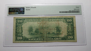 Up for auction is a $20 1929 Staples Minnesota Type 1 National Currency Note. It is issued from The City National Bank of Staples. It is Charter #8523. Staples is a near IMPOSSIBLE to find Minnesota town! This note is graded Choice Fine 15 by PMG! It is noted that this bill has some minor staining. This bill is a must have for any collector of National Currency!